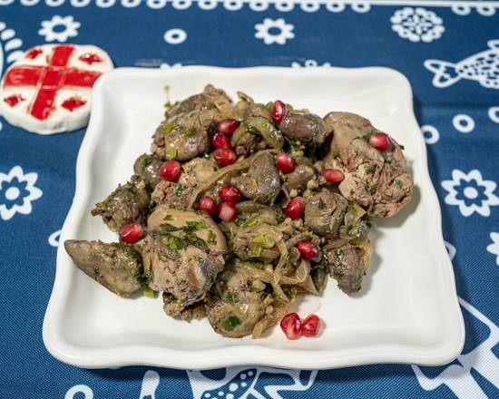 Chicken heart, lungs, liver, kidneys cooked and seasoned with Georgian spices and pomegranate.