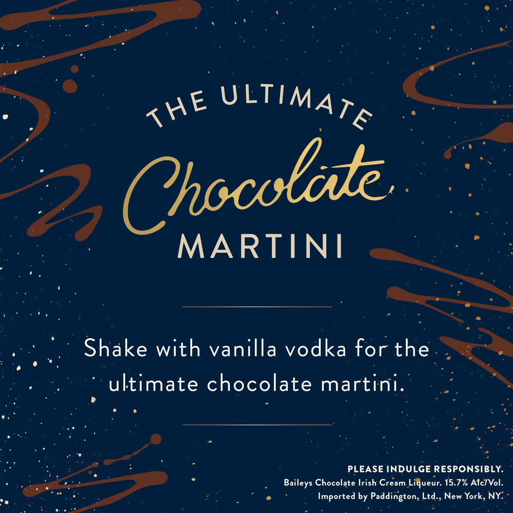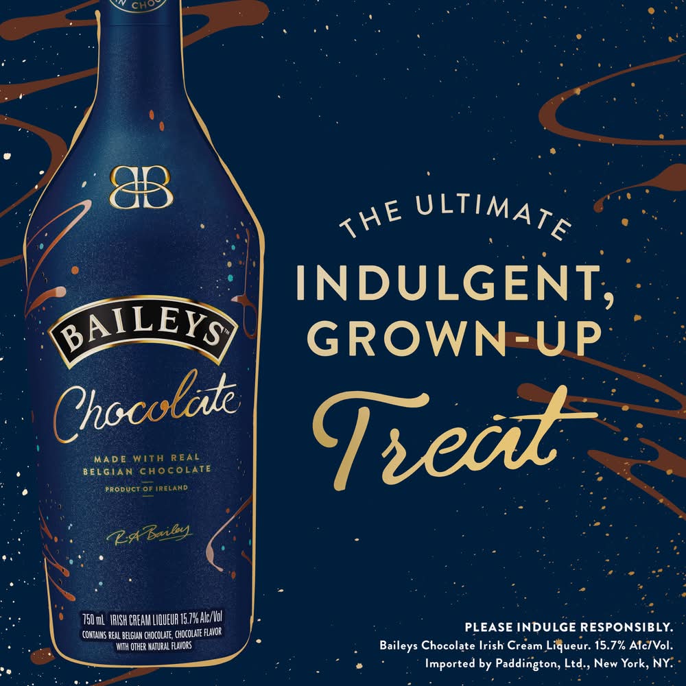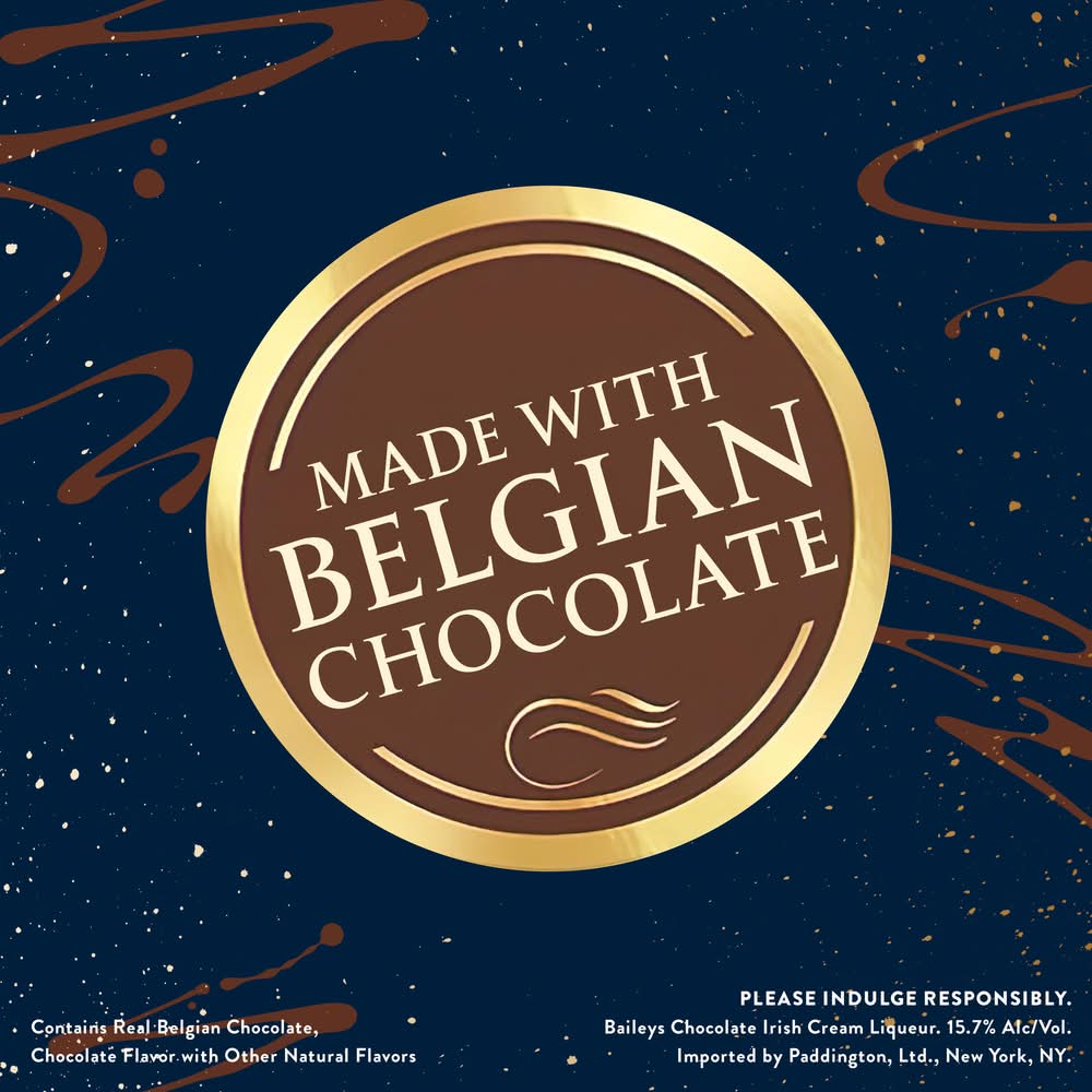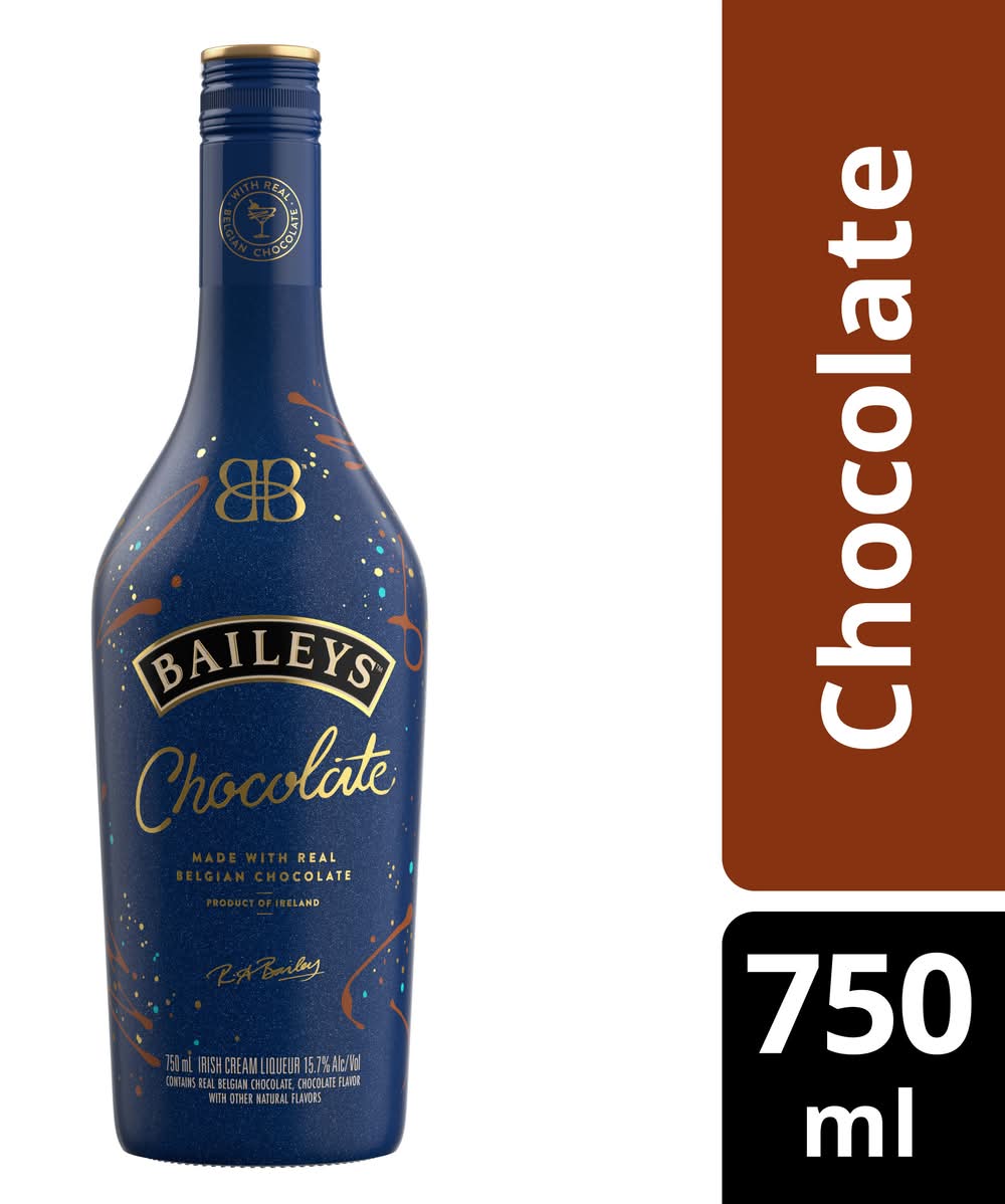 Baileys Chocolate Liqueur is a delightfully decadent chocolate experience that was awarded Double Gold at the San Francisco World Spirits Competition in 2023. It brings together two beloved treats, Baileys and chocolate for the ultimate grown-up treat. Made with real Belgian chocolate blended into delicious Cream from Ireland, Baileys Chocolate Liqueur delivers a velvety-smooth and delicious treat guaranteed to make any moment extra special. Shake, pour, and enjoy in a chocolate martini, neat, or over a decadent dessert for a deliciously indulgent treat. Includes one 31.4 proof 750 mL bottle of Baileys Chocolate Liqueur. Please drink responsibly. Contains real Belgian chocolate, chocolate flavor with other natural flavors. • Flavor: Chocolate • Alcohol by volume: 15.7% • Packaging: Reusable