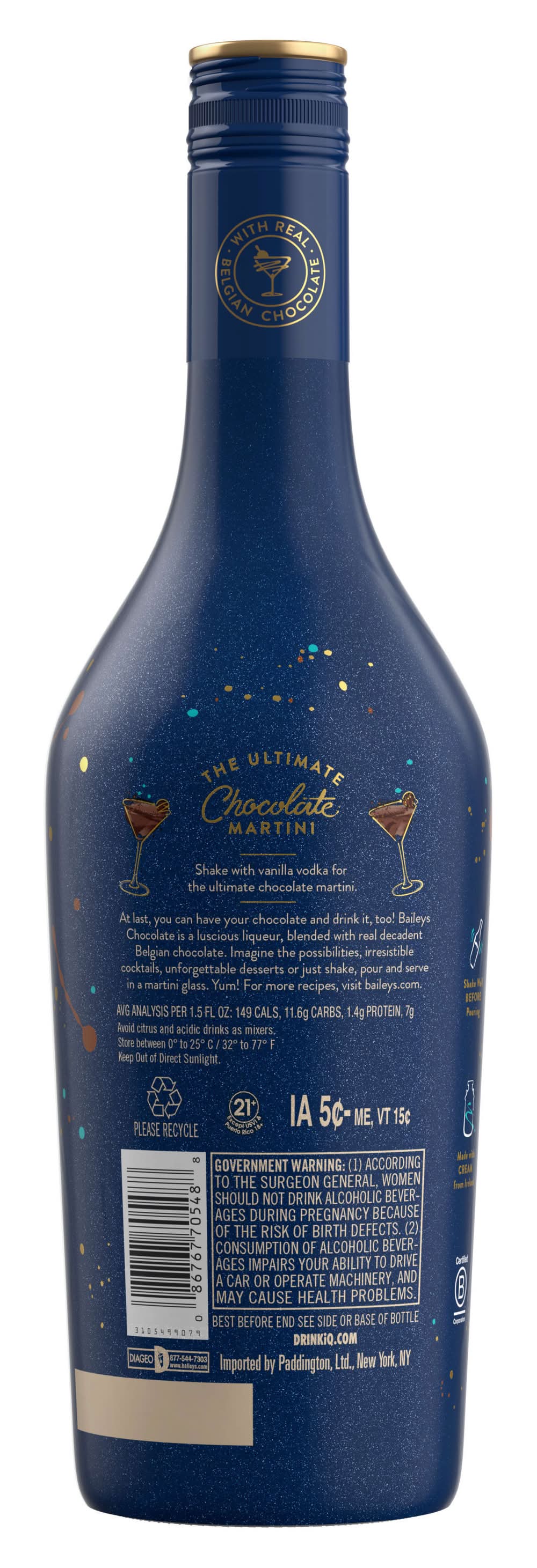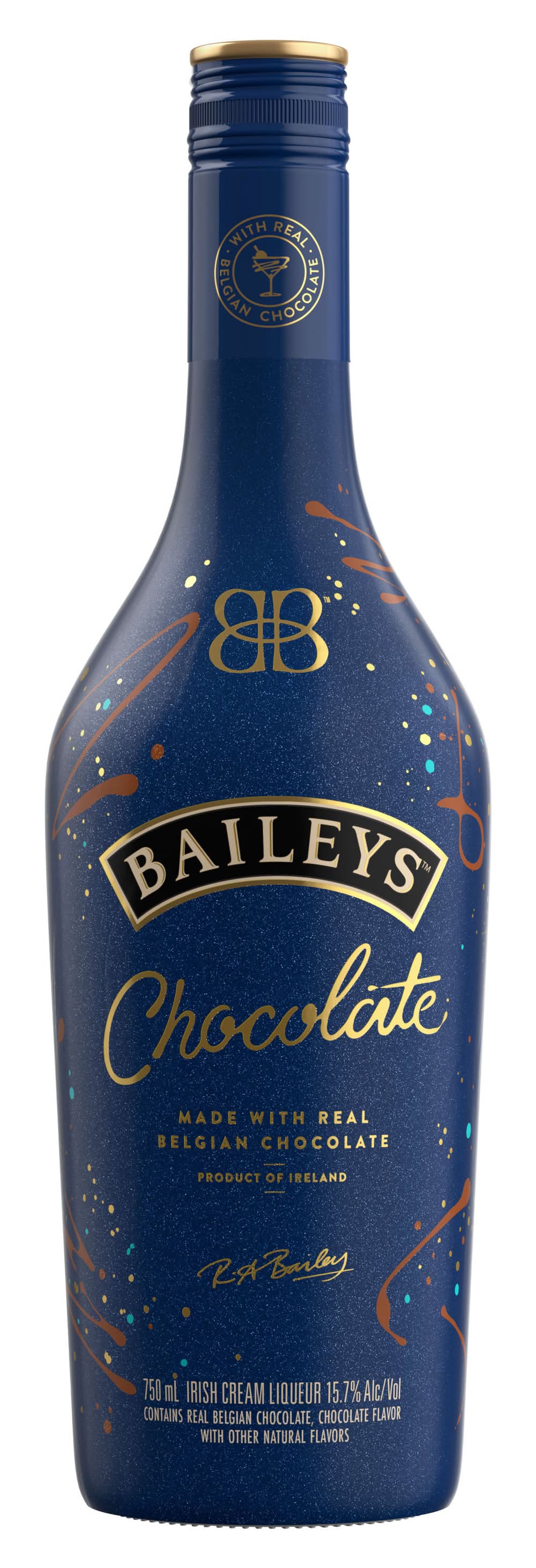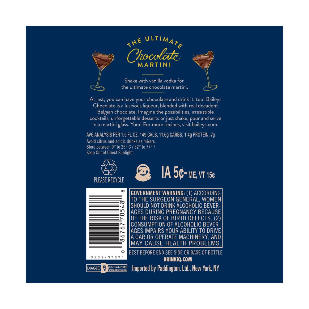Baileys Chocolate Liqueur is a delightfully decadent chocolate experience that was awarded Double Gold at the San Francisco World Spirits Competition in 2023. It brings together two beloved treats, Baileys and chocolate for the ultimate grown-up treat. Made with real Belgian chocolate blended into delicious Cream from Ireland, Baileys Chocolate Liqueur delivers a velvety-smooth and delicious treat guaranteed to make any moment extra special. Shake, pour, and enjoy in a chocolate martini, neat, or over a decadent dessert for a deliciously indulgent treat. Includes one 31.4 proof 750 mL bottle of Baileys Chocolate Liqueur. Please drink responsibly. Contains real Belgian chocolate, chocolate flavor with other natural flavors. • Flavor: Chocolate • Alcohol by volume: 15.7% • Packaging: Reusable