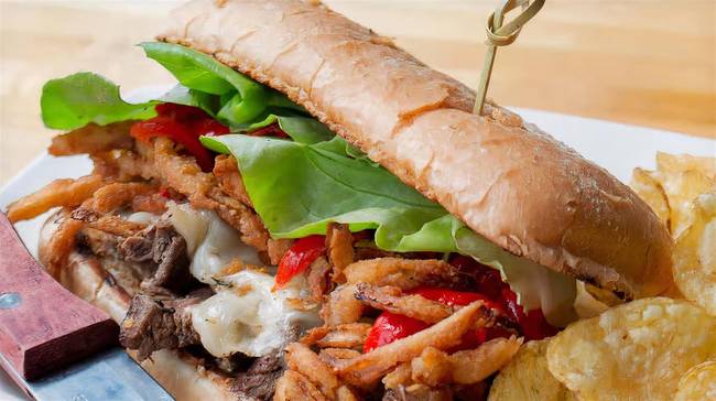 Sliced tenderloin medallion, blackened Philadelphia cream cheese, grilled peppadews, Swiss cheese, onion straws, and bibb lettuce on a grilled and toasty ciabatta roll.