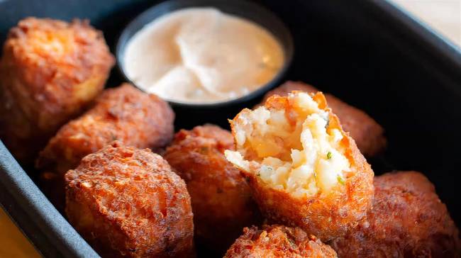Adult-sized version of a childhood fav! Oversized tots stuffed with cheddar, bacon, sour cream, and chives. Served with housemade pub sauce.