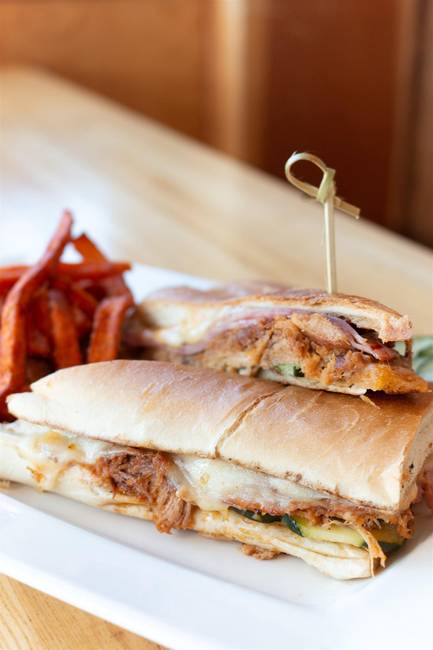 slices of cloverdale farms pork carnitas, shaved ham, swiss cheese, bang-bang sauce and spicy tavern cuke coins on sweet, traditional cuban bread.