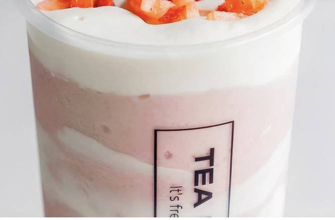 Fresh strawberry smoothie/milk/cheese cream foam on top.