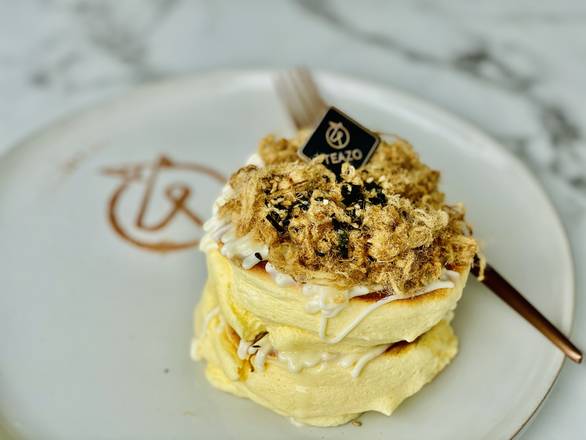 A Japanese style soufflé pancake with salted pork floss on top. Think cottony clouds of heaven that melt in your mouth.