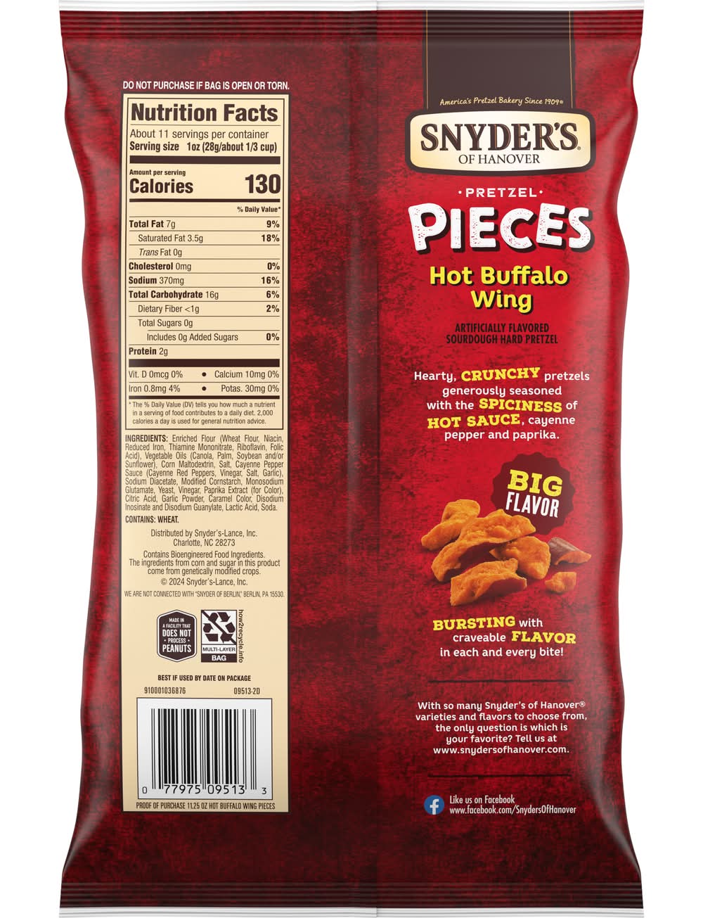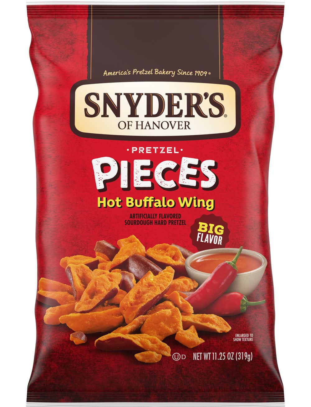 Snyder's of Hanover Hot Buffalo Wing Pretzel Pieces are bursting with big flavor. Enjoy crunchy sourdough pretzels generously seasoned with the spiciness of hot sauce, cayenne pepper, and paprika. You'll love the crunch, hearty satisfaction, and craveable bold flavor found in every bite of these Pretzel Pieces. These crunchy pretzel pieces are a perfect snack for tailgates, parties, or movie night. • Flavor: Hot buffalo wing • Snyder's-Lance, Inc., Charlotte, NC, 28277