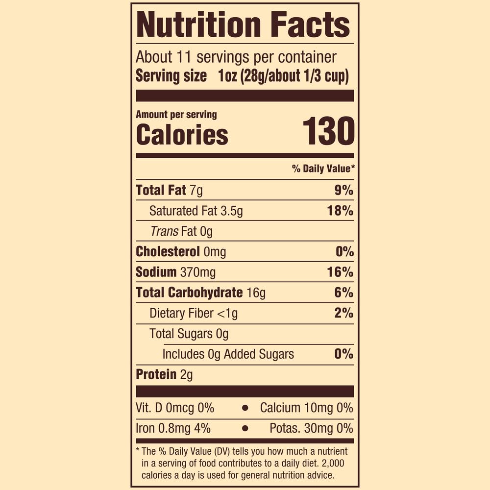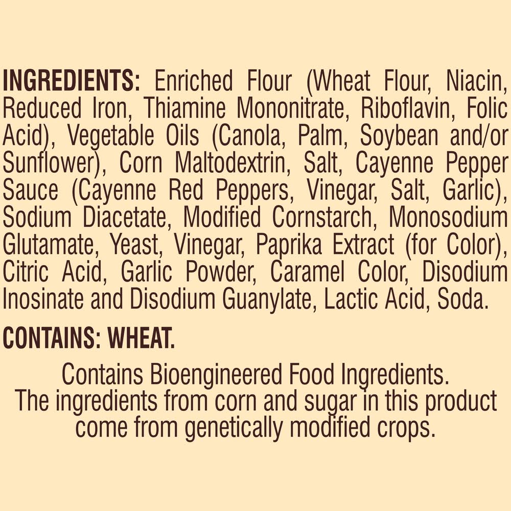 Ingredients: INGREDIENTS: ENRICHED FLOUR (WHEAT FLOUR, NIACIN, REDUCED IRON, THIAMINE MONONITRATE, RIBOFLAVIN, FOLIC ACID), VEGETABLE OILS (CANOLA, PALM, SOYBEAN AND/OR SUNFLOWER), CORN MALTODEXTRIN, SALT, CAYENNE PEPPER SAUCE (CAYENNE RED PEPPERS, VINEGAR, SALT, GARLIC), SODIUM DIACETATE, MODIFIED CORNSTARCH, MONOSODIUM GLUTAMATE, YEAST, VINEGAR, PAPRIKA EXTRACT (FOR COLOR), CITRIC ACID, GARLIC POWDER, CARAMEL COLOR, DISODIUM INOSINATE AND DISODIUM GUANYLATE, LACTIC ACID, SODA. CONTAINS: WHEAT Contains: Wheat, Corn