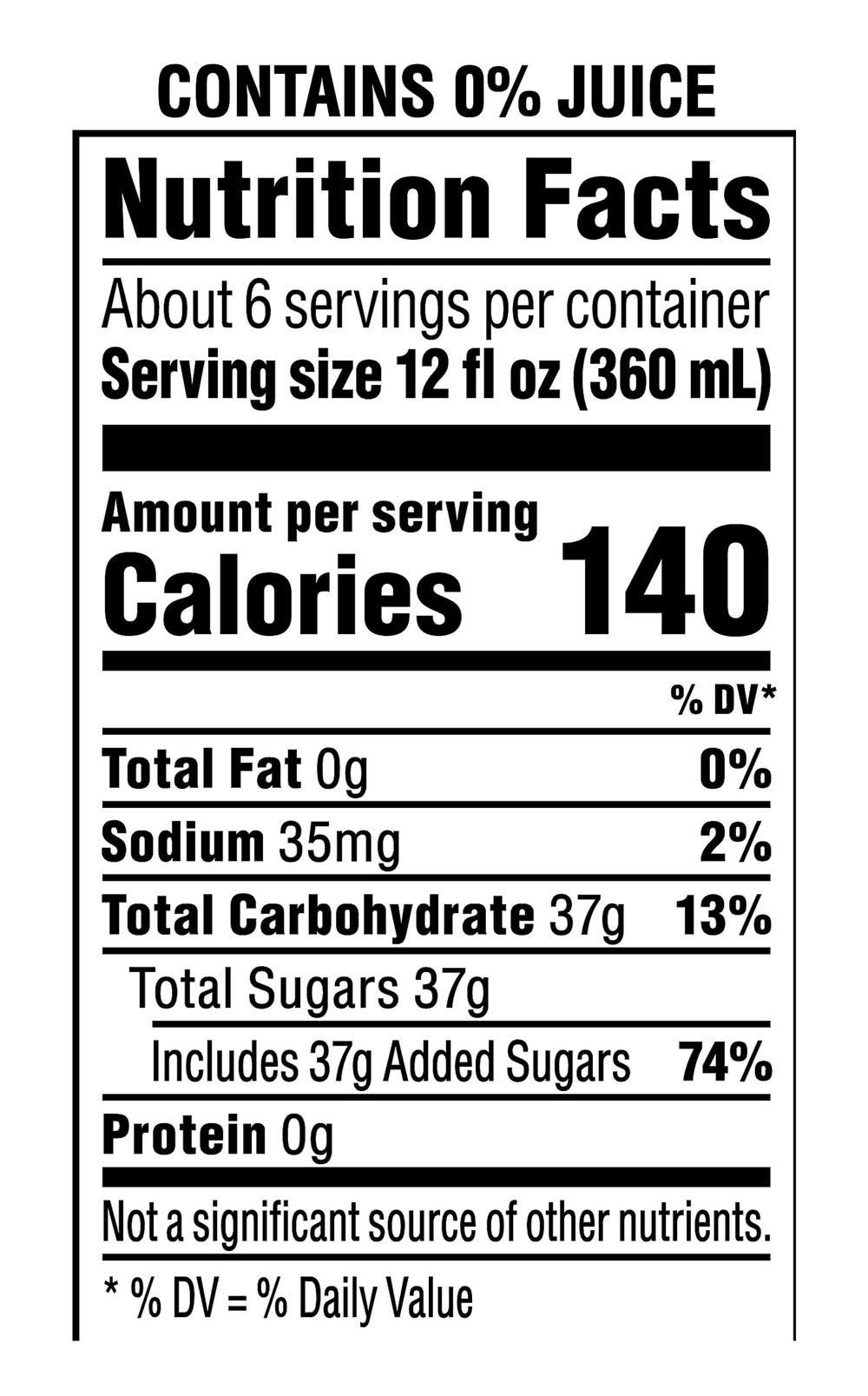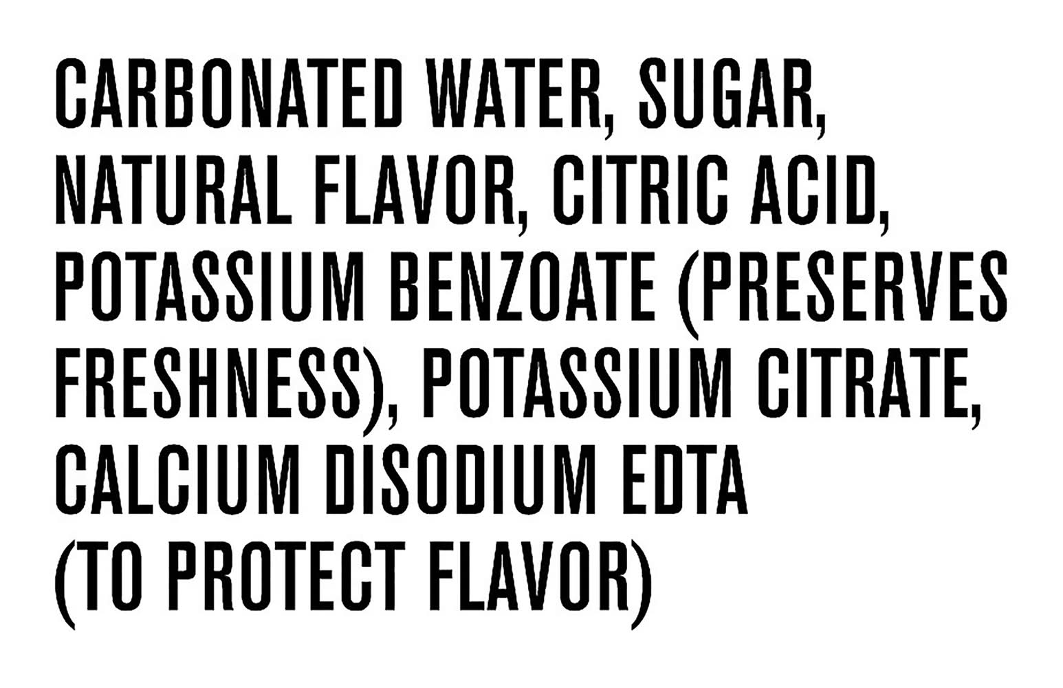 Ingredients: Carbonated Water, Sugar, Natural Flavor, Citric Acid, Potassium Benzoate (Preserves Freshness), Potassium Citrate, Calcium Disodium EDTA (to Protect Flavor)