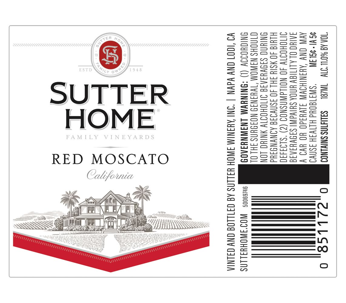 Sutter Home Red Moscato Wine is a luscious fusion of red and white wine, bursting with sweet berry flavors. This California red wine offers a luxurious, creamy mouthfeel balanced by its vibrant, refreshing finish. Fresh strawberry and cherry aromas reveal sweet berry flavors complemented by hints of rose petal on the palate. Sutter Home Red Moscato received 91 points - Gold from 2021 Monterey Int'l and 90 points - Gold from 2021 San Diego Int'l. Perfect with both sweet and savory foods, this red wine pairs well with spicy Asian and Thai cuisine, jerk chicken or warm berry pie. After letting the skins and juice mingle for 24 hours, winemakers cold ferment and age this sweet California wine in refrigerated stainless steel tanks to preserve the fresh, fragrant aromas and bright flavors. This four pack of mini bottled wine has 11.8% alcohol by volume. Sutter Home, family owned since 1948, is the brand generations of wine lovers trust to deliver consistent, award-winning quality and value for every wine occasion. • Pack size: 4 • Features : screw cap • Alcohol by volume: 11%