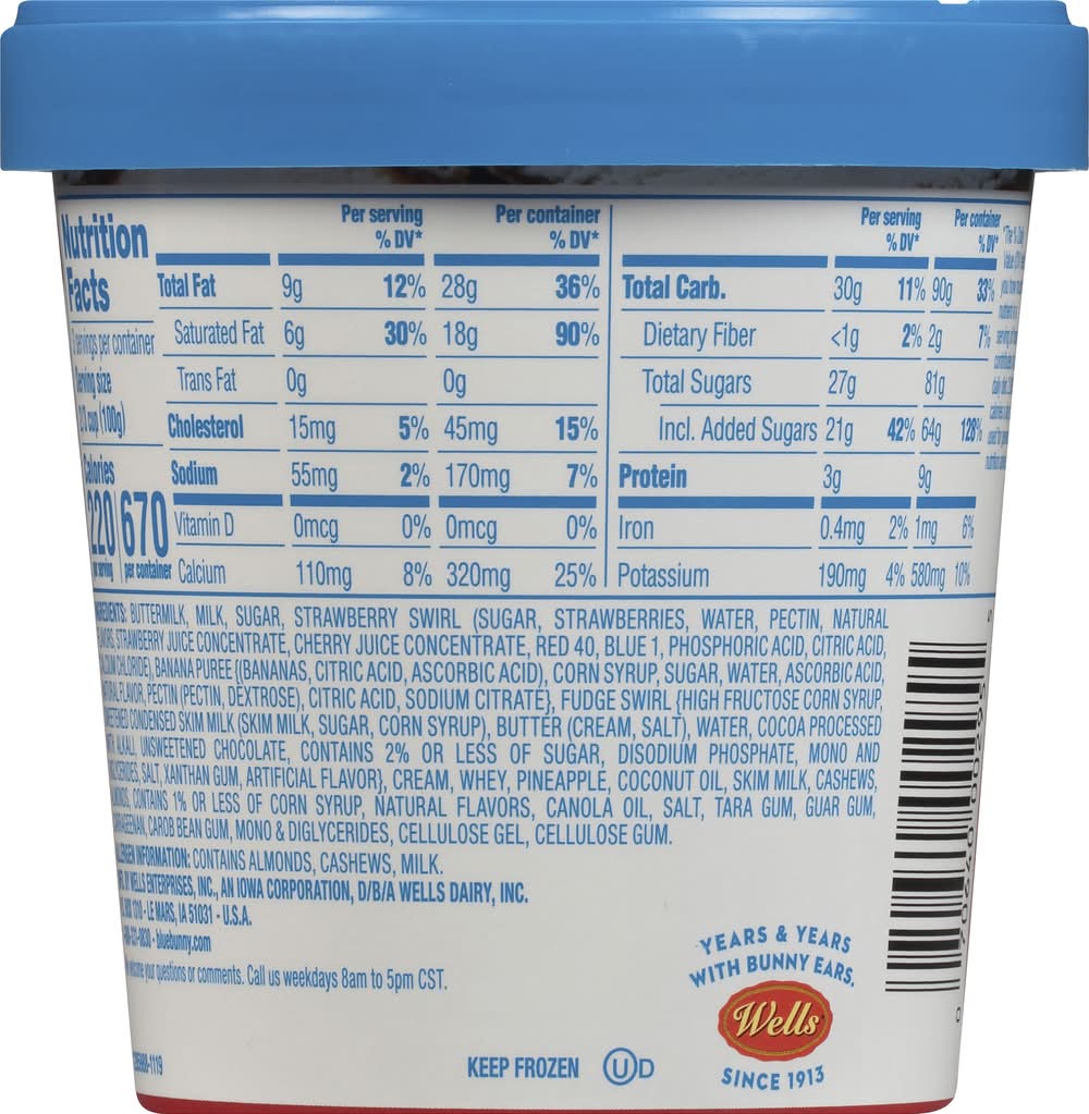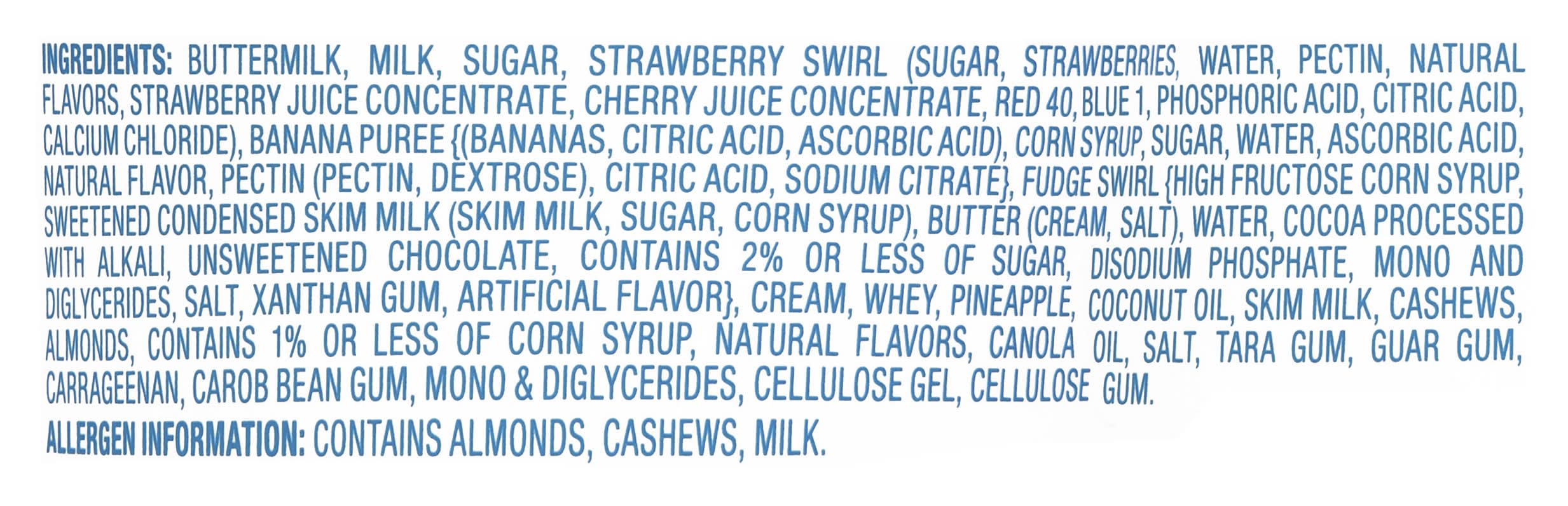 Ingredients: Buttermilk, Milk, Sugar, Strawberry Swirl (Sugar, Strawberries, Water Pectin, Natural Flavors, Strawberry Juice Concentrate, Cherry Juice Concentrate, Red 40, Blue 1, Phosphoric Acid, Citric Acid, Calcium Chloride), Banana Puree {(Bananas, Citric Acid, Ascorbic Acid), Corn Syrup, Sugar, Water, Ascorbic Acid, Natural Flavor, Pectin (Pectin, Dextrose), Citric Acid, Sodium Citrate}, Fudge Swirl {High Fructose Corn Syrup, Sweetened Condensed Skim Milk (Skim Milk, Sugar, Corn Syrup), Butter (Cream Salt), Water, Cocoa Processed with Alkali, Unsweetened Chocolate, Contains 2% or Less of Sugar Disodium Phosphate, Mono and Diglycerides, Salt, Xanthan Gum, Artificial Flavor}, Cream, Whey, Pineapple Coconut Oil, Skim Milk, Cashews, Almonds, Contains 1% or Less of Corn Syrup, Natural Flavors, Canola Oil, Salt, Tara Gum, Gum Gum, Carrageenan, Carob Bean Gum, Mono & Diglycerides, Cellulose Gel, Cellulose Gum. Contains: Tree Nuts, Milk