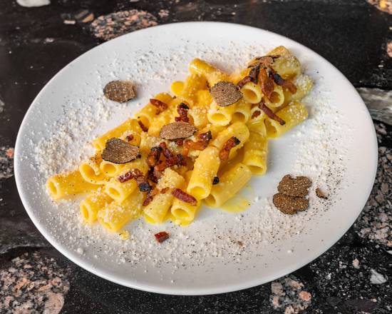 Homemade Rigatoni pasta shape in Carbonara sauce covered with Guanciale and black truffle