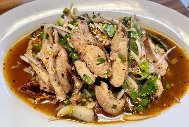 Specially marinated pork shoulder, grilled, sliced thin, tossed with Thai seasonings, shallots, culantro, scallions, mint, lime juice & roasted rice. Served with sticky rice.