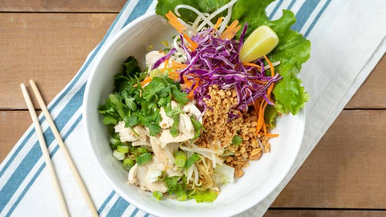 Steamed egg noodles with garlic sauce, ground peanuts, bean sprouts, spinach, green onions