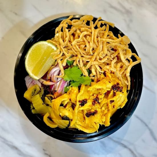 Northern Thai curry noodles. Egg noodles in curry with choice of protein or vegetables. Served with pickle, red onion, cilantro, lime and crispy noodles.