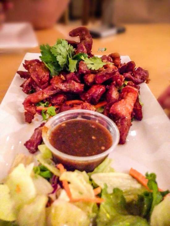 Deep fried marinated pork jerky Thai style served with traditional sauce.