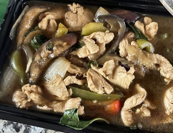 Stir fried purple eggplant with choice of meat, onion, bell pepper,and basil in medium spicy brown garlic sauce.