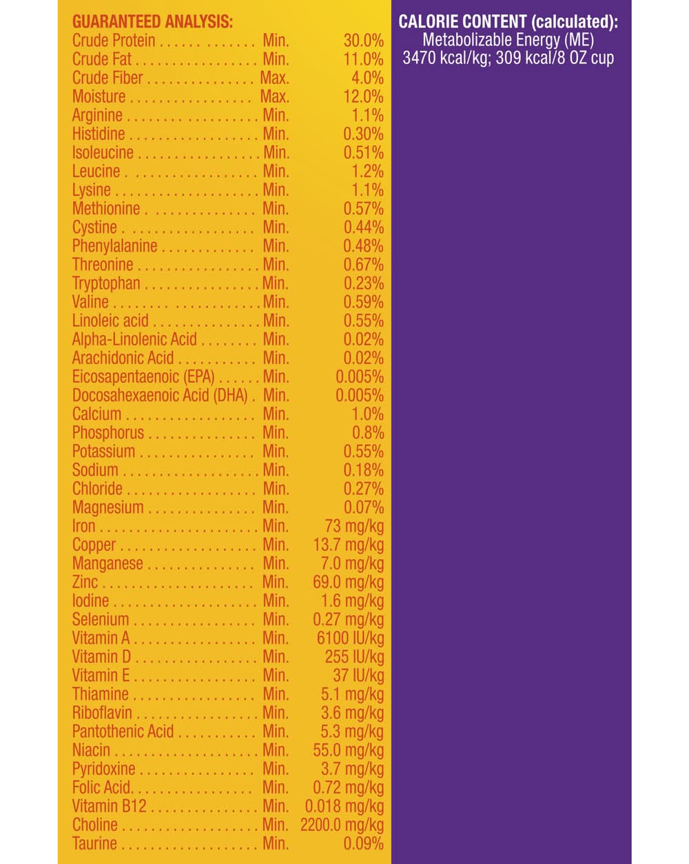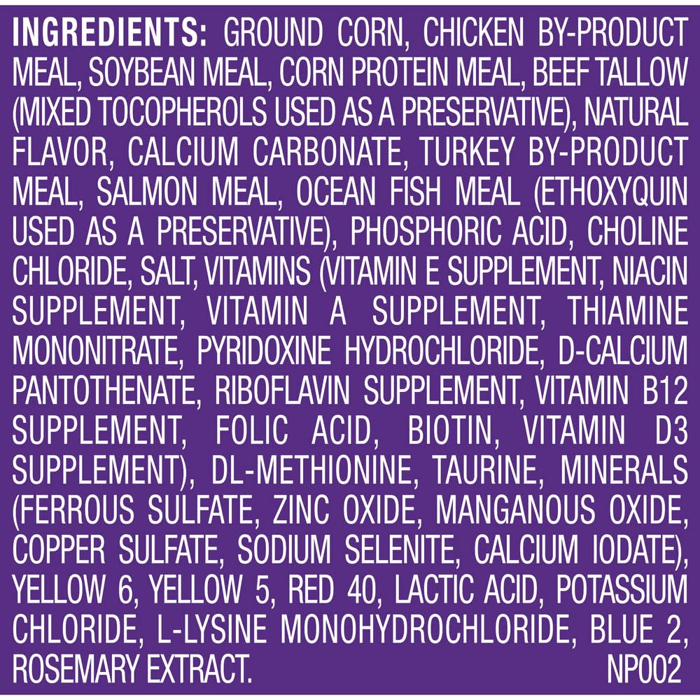 Ingredients: Ground Corn, Chicken By-Product Meal, Soybean Meal, Corn Protein Meal, Beef Tallow (Mixed Tocopherols Used As A Preservative), Natural Flavor, Calcium Carbonate, Turkey By-Product Meal, Salmon Meal, Ocean Fish Meal (Ethoxyquin Used As A Preservative), Phosphoric Acid, Choline Chloride, Salt, Vitamins (Vitamin E Supplement, Niacin Supplement, Vitamin A Supplement, Thiamine Mononitrate, Pyridoxine Hydrochloride, D-Calcium Pantothenate, Riboflavin Supplement, Vitamin B12 Supplement, Folic Acid, Biotin, Vitamin D3 Supplement), Dl-Methionine, Taurine, Minerals (Ferrous Sulfate, Zinc Oxide, Manganous Oxide, Copper Sulfate, Sodium Selenite, Calcium Iodate), Yellow 6, Yellow 5, Red 40, Lactic Acid, Potassium Chloride, L-Lysine Monohydrochloride, Blue 2, Rosemary Extract