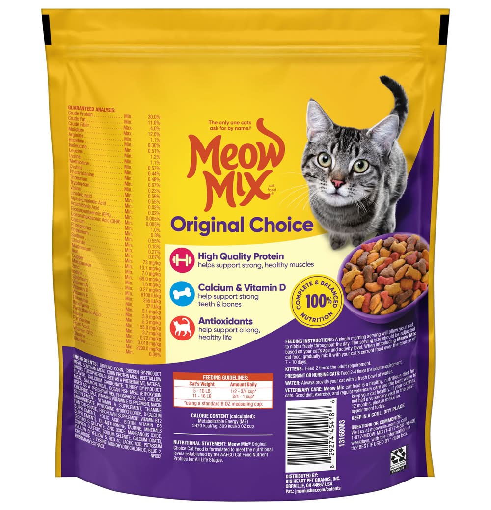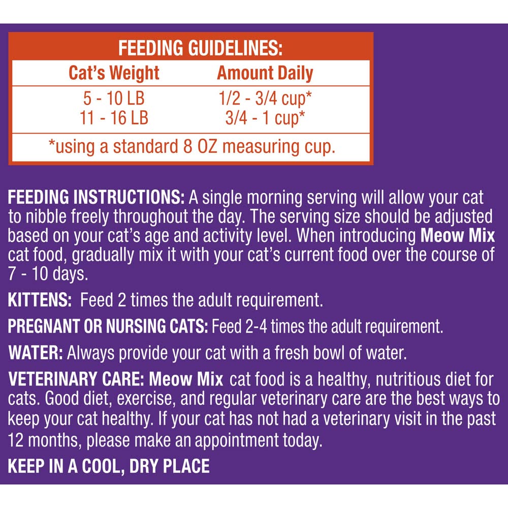Feeding guidelines: 5-9 lb., 1/2 to 1 cup daily; 10-14 lb., 1 to 1-1/2 cups daily. (using a standard 8 oz. measuring cup.) feeding instructions: a single morning serving will allow your cat to nibble freely throughout the day. the serving size should be adjusted based on your cat's age and activity level. when introducing meow mix cat food, gradually mix it with your cat's current food over the course of 7-10 days. kittens: feed 2 times the adult requirement. pregnant or nursing cats: feed 2-4 times the adult requirement. water: always provide your cat with a fresh bowl of water. veterinary care: meow mix cat food is healthy, nutritious diet for cats. good diet, exercise, and regular veterinary care are the best ways to keep your cat healthy. if your cat has not had a veterinary visit in the past 12 months, please make an appointment today. keep in a cool, dry place.
