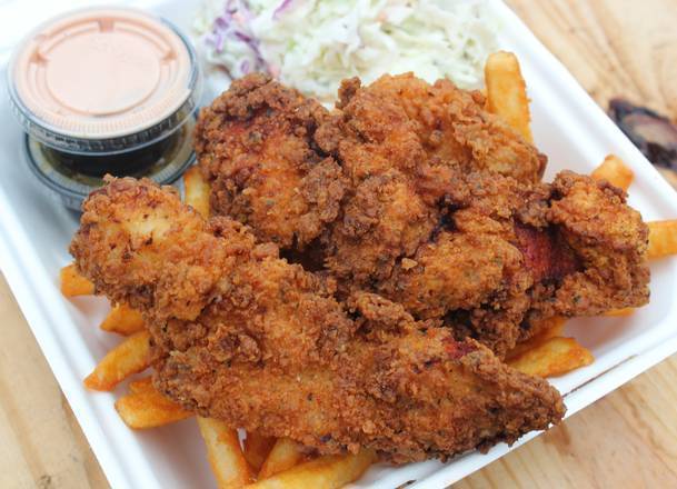 Three Hand-Breaded Chicken Strips, Fries, Coleslaw, and your choice of 2 dipping sauces & drink.