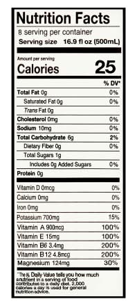 Ingredients: Filtered Water, Coconut Water from Concentrate, Citric Acid, Dipotassium Phosphate, Natural Flavor, Trimagnesium Citrate, Sucralose, L-Isoleucine, L-Leucine, L-Valine, D-Alpha Tocopheryl Acetate (Vitamin E), Acesulfame Potassium, Retinyl Palmitate (Vitamin A), Pyridoxine Hydrochloride (Vitamin B6), Cyanocobalamin (Vitamin B12) Contains: Coconut, Nuts / Tree Nuts
