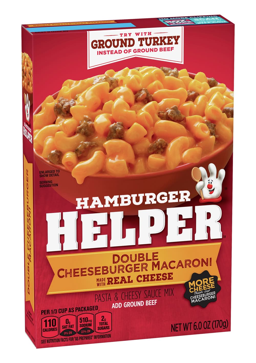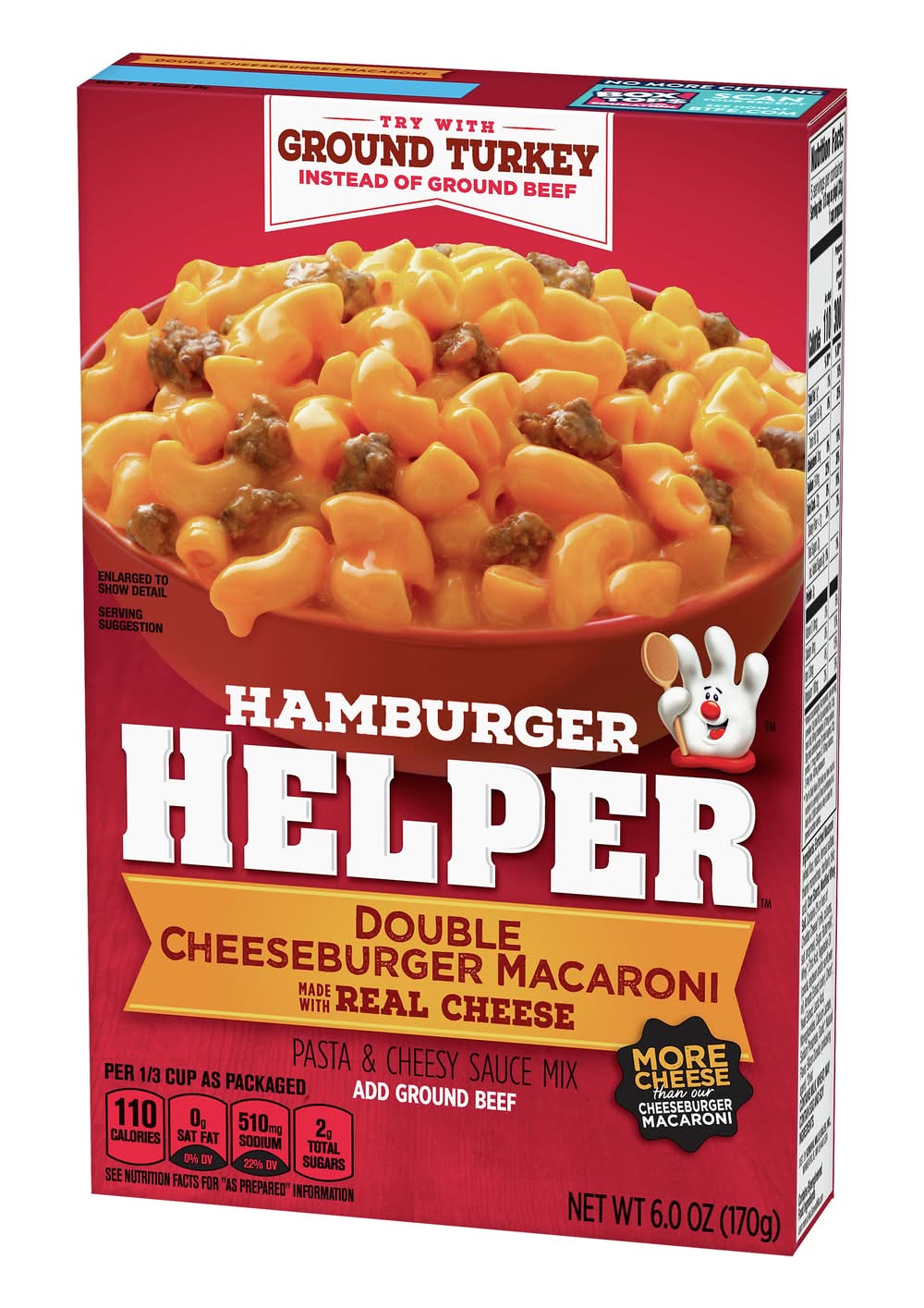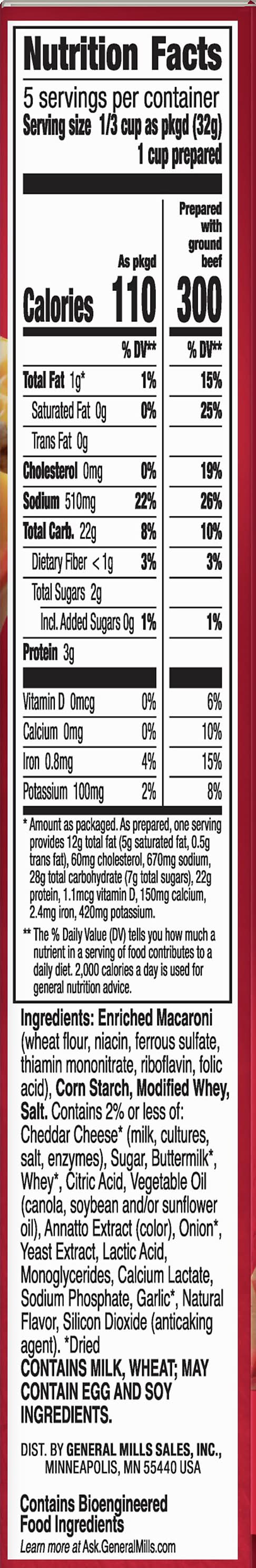Made with real cheese. Per 1/3 Cup as Packaged: 110 calories; 0 g sat fat (0% DV); 510 mg sodium (22% DV); 2 g total sugars. See nutrition facts for as prepared information. Contains bioengineered food ingredients. Learn more at Ask.GeneralMilks.com. Try with ground Turkey instead of ground beef. More cheese than our cheeseburger macaroni. Add ground beef. Add your own twist! Add your own twist. Into yummy bacon deliciousness? Just before serving, stir in chopped cooked bacon and diced tomatoes, and for unexpected zest, chopped pickles. www.HamburgerHelper.com. Questions? Call 1-800-828-3291 www.HamburgerHelper.com. Looking for more ways to add a fresh twist? Visit HamburgerHelper.com. No more clipping. Box Tops for Education. Scan your receipt. See how at btfe.com. 100% Recycled paperboard. • General Mills Sales, Inc., Minneapolis, MN, 55440 • Packaging: Reusable