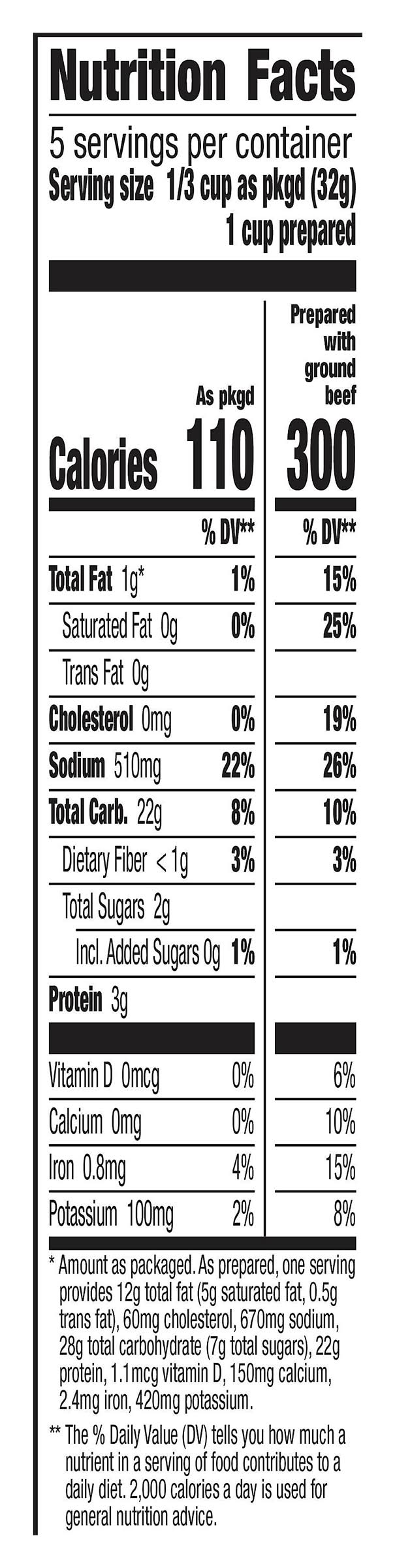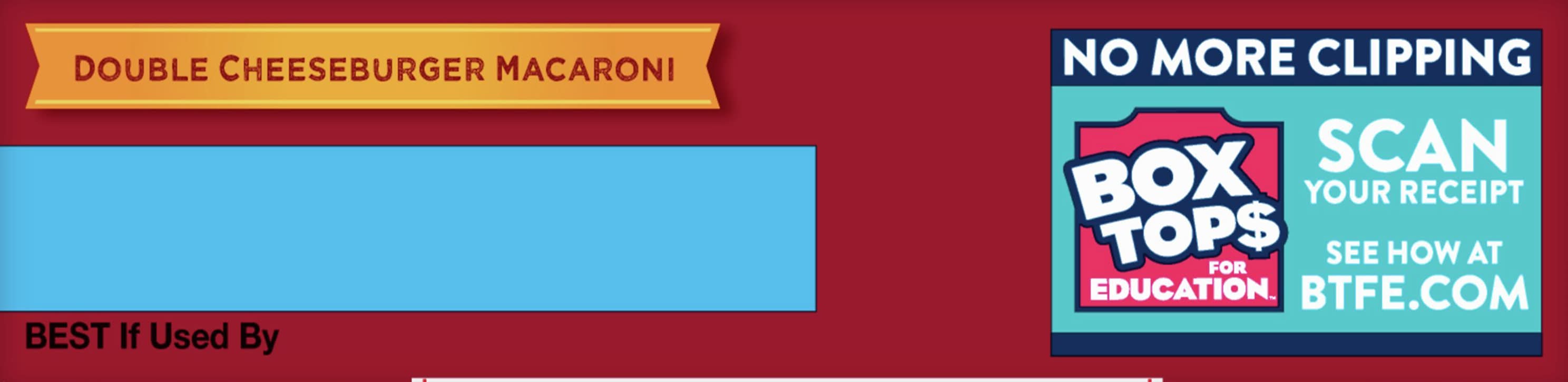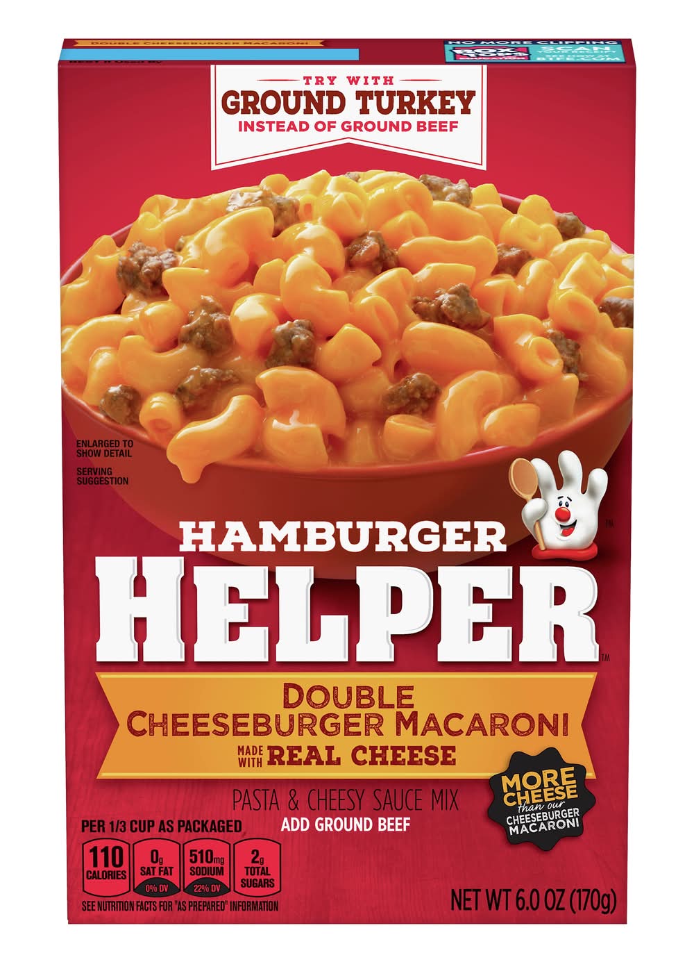 Made with real cheese. Per 1/3 Cup as Packaged: 110 calories; 0 g sat fat (0% DV); 510 mg sodium (22% DV); 2 g total sugars. See nutrition facts for as prepared information. Contains bioengineered food ingredients. Learn more at Ask.GeneralMilks.com. Try with ground Turkey instead of ground beef. More cheese than our cheeseburger macaroni. Add ground beef. Add your own twist! Add your own twist. Into yummy bacon deliciousness? Just before serving, stir in chopped cooked bacon and diced tomatoes, and for unexpected zest, chopped pickles. www.HamburgerHelper.com. Questions? Call 1-800-828-3291 www.HamburgerHelper.com. Looking for more ways to add a fresh twist? Visit HamburgerHelper.com. No more clipping. Box Tops for Education. Scan your receipt. See how at btfe.com. 100% Recycled paperboard. • General Mills Sales, Inc., Minneapolis, MN, 55440 • Packaging: Reusable