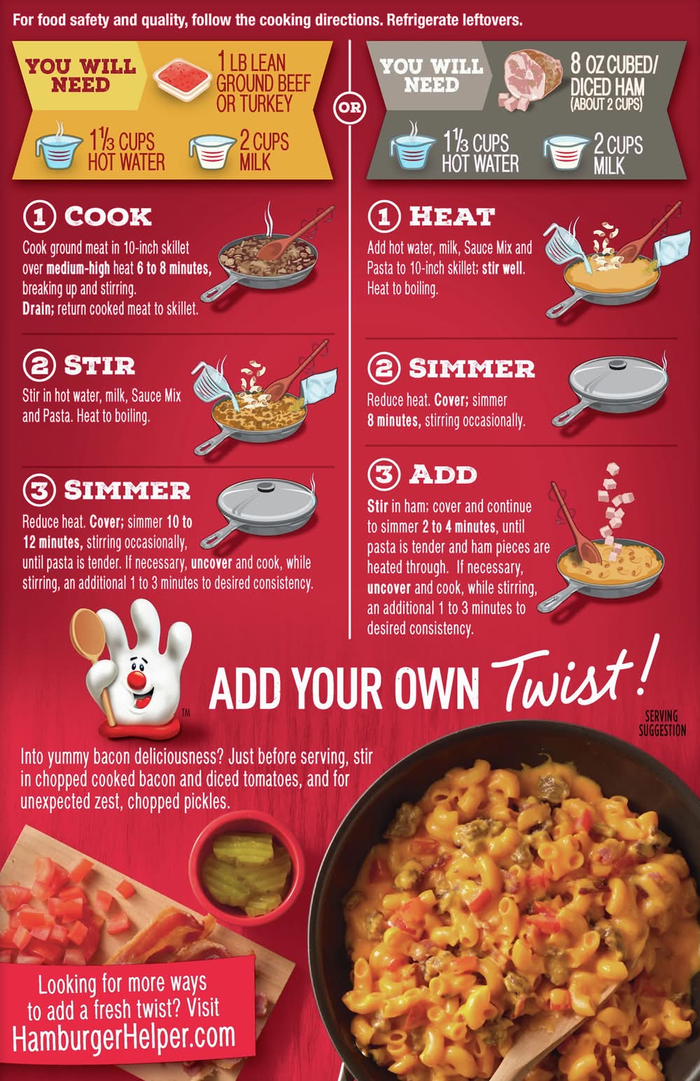 For food safety and quality, follow the cooking directions. refrigerate leftovers. you will need: 1 lb lean ground beef or turkey; 1-1/3 cups hot water; 2 cups milk. (1) cook: cook ground meat in 10-inch skillet over medium - high heat 6 to 8 minutes, breaking up and stirring. drain; return cooked meat to skillet. (2) stir: stir in hot water, milk, sauce mix and pasta. heat to boiling. (3) simmer: reduce heat. cover; simmer 10 to 12 minutes, stirring occasionally, until pasta is tender. if necessary, uncover and cook, while stirring, an additional 1 to 3 minutes to desired consistency. you will need: 8 oz cubed / diced ham (about 2 cups) 1-1/3 cups hot water; 2 cups milk. (1) heat: add hot water, milk, sauce mix and pasta to 10-inch skillet; stir well. heat to boiling. (2) simmer: reduce heat. cover; simmer 8 minutes, stirring occasionally. (3) add: stir in ham; cover and continue to simmer 2 to 4 minutes, until pasta is tender and ham pieces are heated through. if necessary, uncover and cook, while stirring, an additional 1 to 3 minutes to desired consistency.