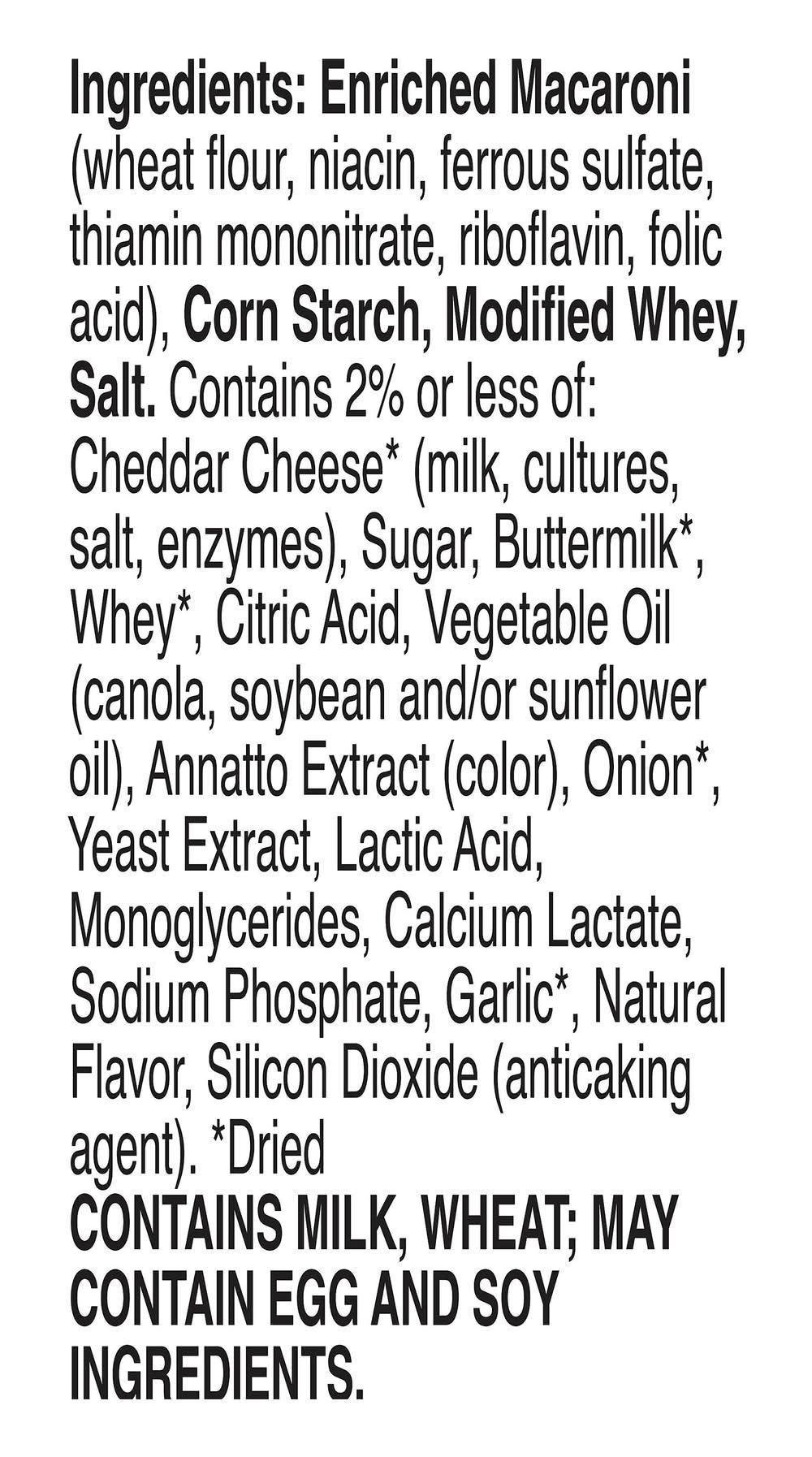 Ingredients: Enriched Macaroni (Wheat Flour Niacin Ferrous Sulfate Thiamin Mononitrate Riboflavin Folic Acid), Corn Starch, Modified Whey, Salt, Contains 2% or Less of: Cheddar Cheese (Dried), (Milk Cultures Salt Enzymes), Sugar, Buttermilk (Dried), Whey (Dried), Citric Acid, Vegetable Oil (Canola Soybean and/or Sunflower Oil), Annatto Extract (Color), Onion (Dried), Yeast Extract, Lactic Acid, Monoglycerides, Calcium Lactate, Sodium Phosphate, Garlic (Dried), Natural Flavor, Silicon Dioxide (Anticaking Agent) Contains: Wheat, Milk, Soybeans, Eggs