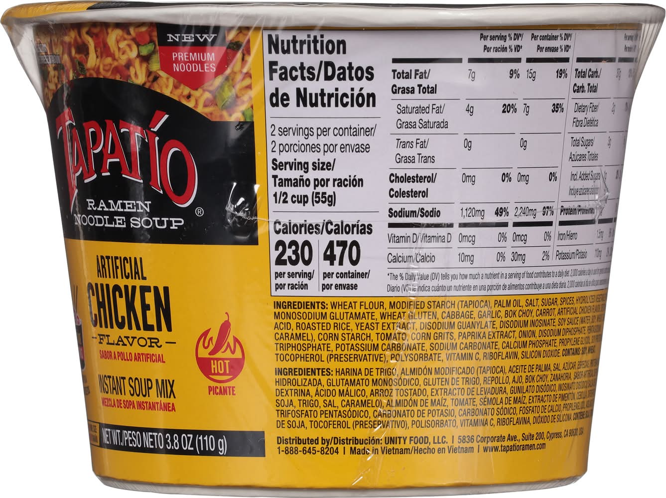 Ingredients: Wheat Flour, Modified Starch (Tapioca), Palm Oil, Salt, Sugar, Spices, Hydrolyzed Vegetable Protein, Monosodium Glutamate, Wheat Gluten, Cabbage, Garlic, Bok Choy, Carrot, Artificial Chicken Flavor, Dextrin, Malic Acid, Roasted Rice, Yeast Extract, Disodium Guanylate, Disodium Inosinate, Soy Sauce (Water, Soy, Wheat, Salt, Caramel), Corn Starch, Tomato, Corn Grits, Paprika Extract, Onion, Disodium Diphosphate, Pentasodium Triphosphate, Potassium Carbonate, Sodium Carbonate, Calcium Phosphate, Propylene Glycol, Soy Protein Isolate, Tocopherol (Preservative), Polysorbate, Vitamin C, Riboflavin, Silicon Dioxide Contains: Soybeans, Wheat, Gluten