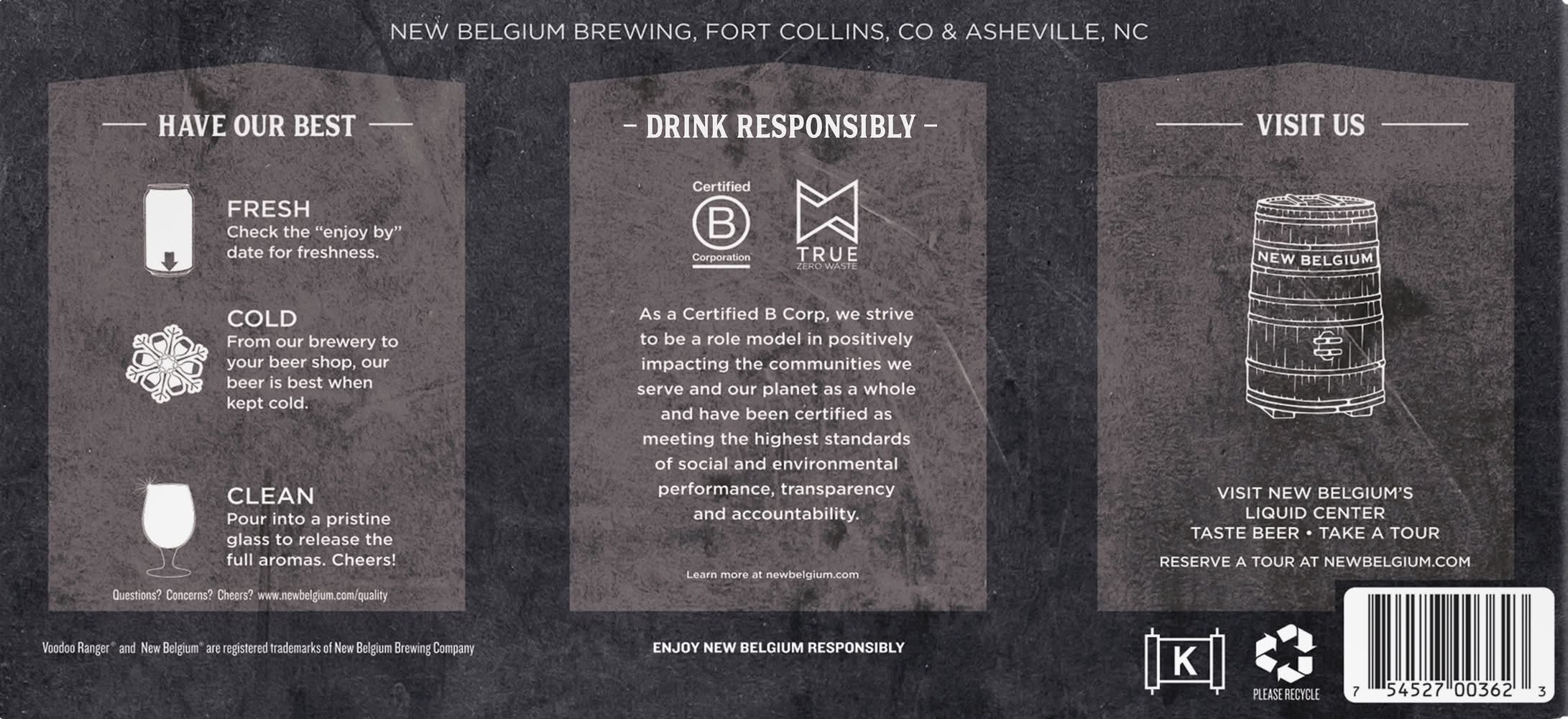 Drink responsibly. Enjoy new belgium responsibly. Taste beer. Take a tour. We strive to be a role model in positively impacting the communities we serve and our planet as a whole and have been certified as meeting the highest standards of social environmental performance, transparency and accountability. Please recycle. 7% abv. 14 • Pack size: 12 • Alcohol by volume: 7% • Packaging: Reusable