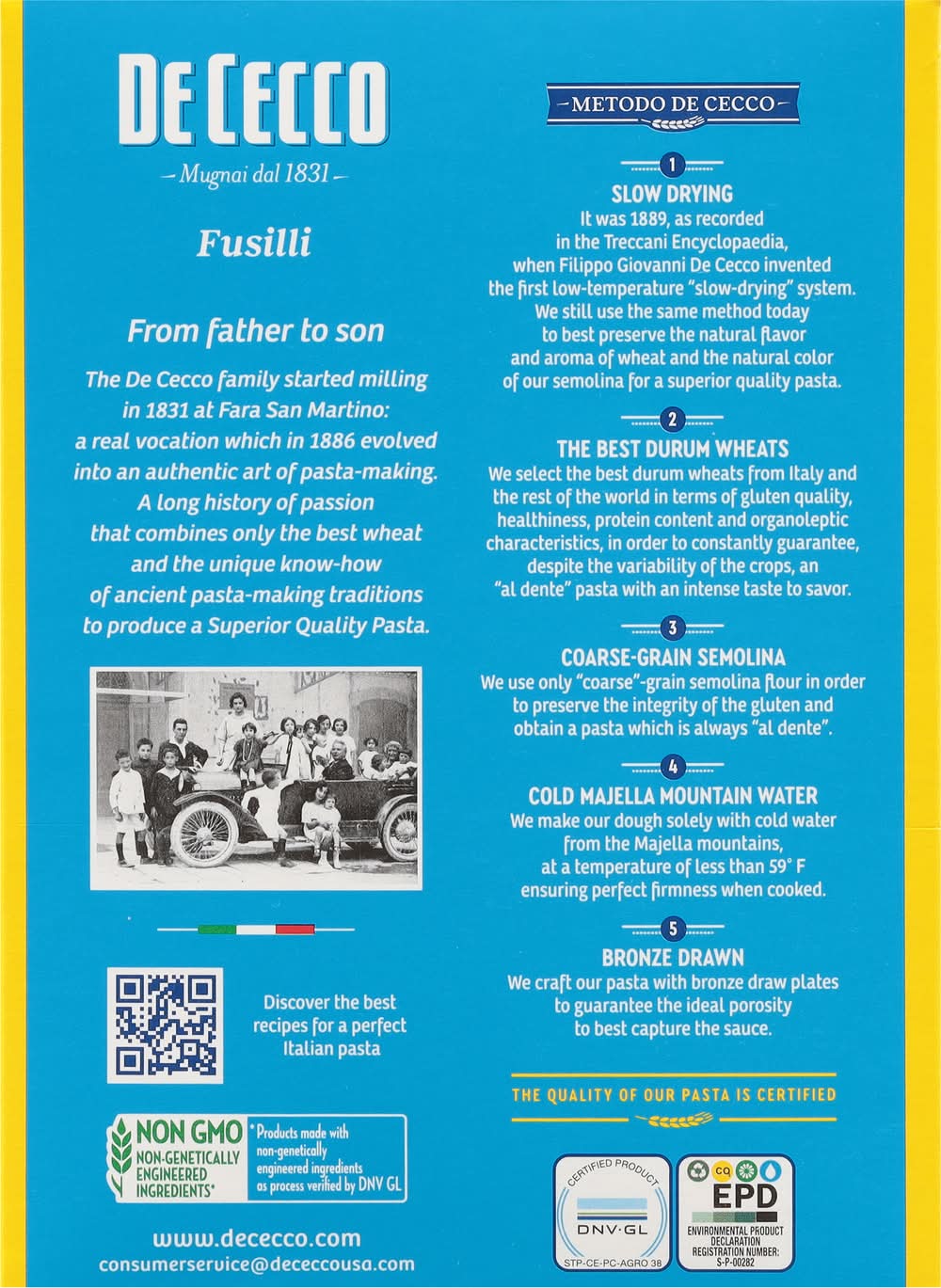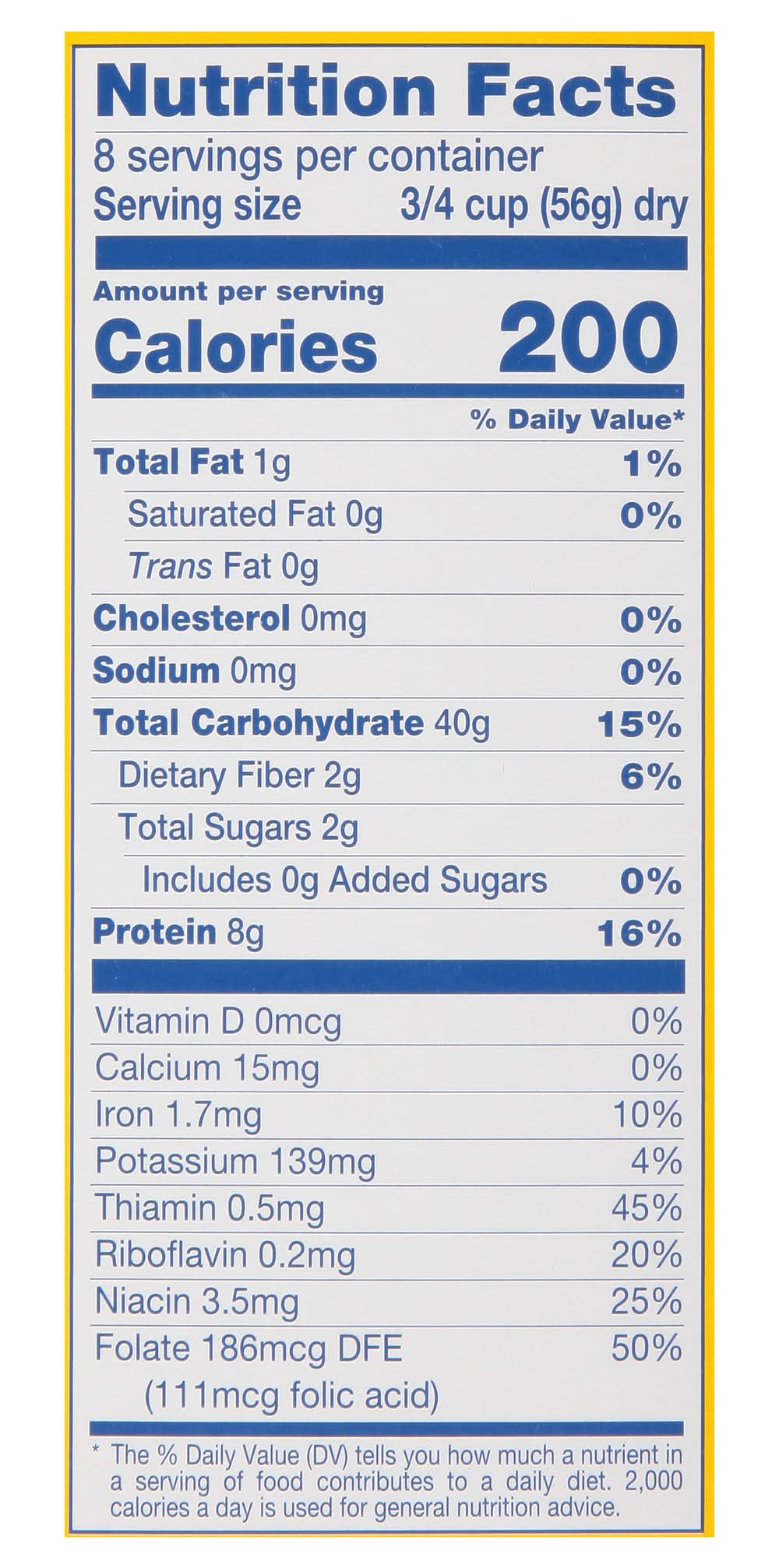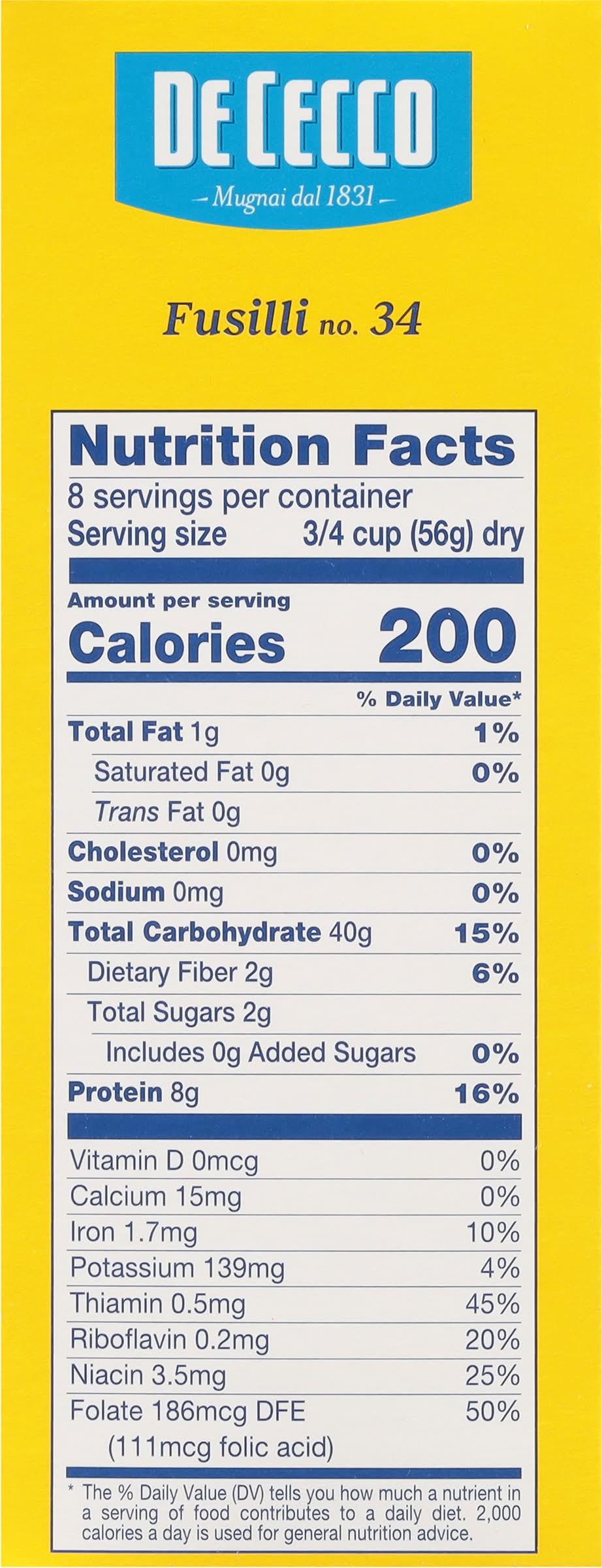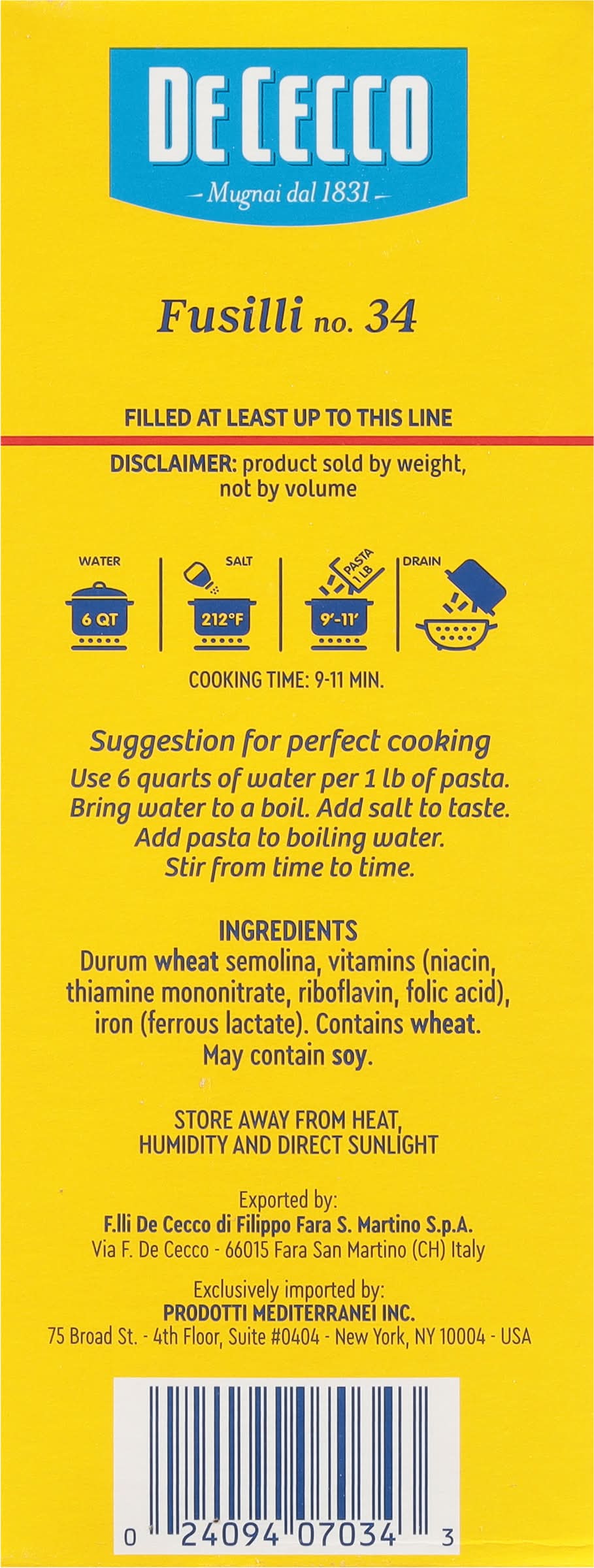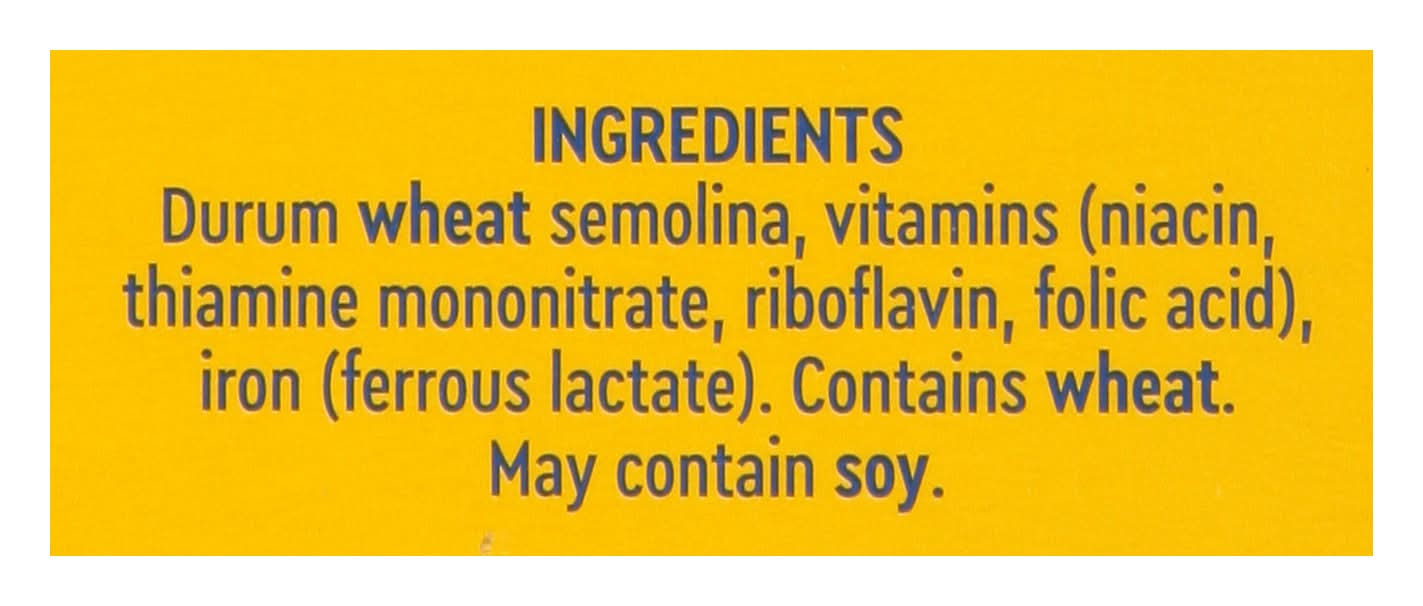 Ingredients: Durum Wheat Semolina, Vitamins (Niacin, Thiamine Mononitrate, Riboflavin, Folic Acid), Iron (Ferrous Lactate) Contains: Wheat, Soybeans