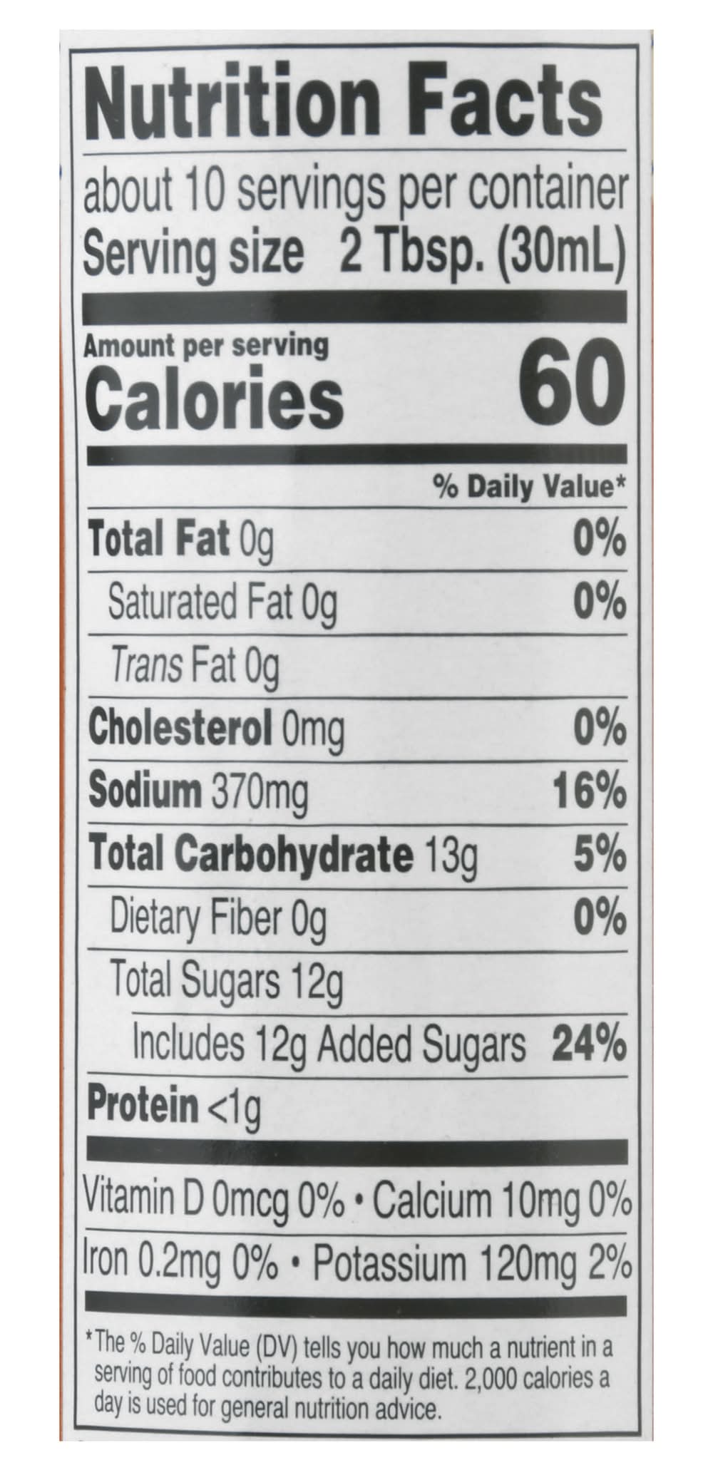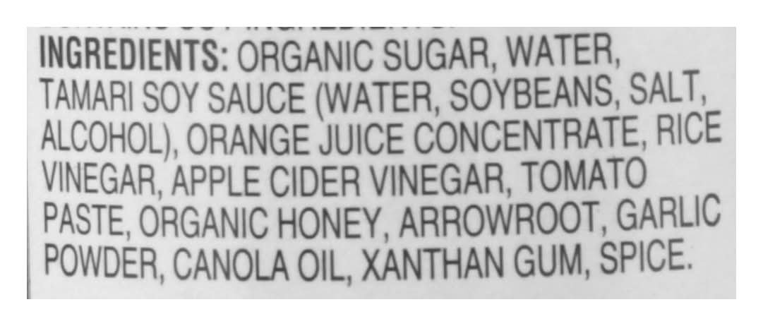 Ingredients: Organic Sugar, Water, Tamari Soy Sauce (Water, Soybeans, Salt, Alcohol), Orange Juice Concentrate, Rice Vinegar, Apple Cider Vinegar, Tomato Paste, Organic Honey, Arrowroot, Garlic Powder, Canola Oil, Xanthan Gum, Spice Contains: Soybeans