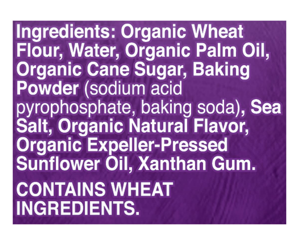 Ingredients: Organic Wheat Flour, Water, Organic Palm Oil, Organic Cane Sugar, Baking Powder (Sodium Acid Pyrophosphate, Baking Soda), Sea Salt, Organic Natural Flavor, Organic Expeller-Pressed Sunflower Oil, Xanthan Gum Contains: Wheat