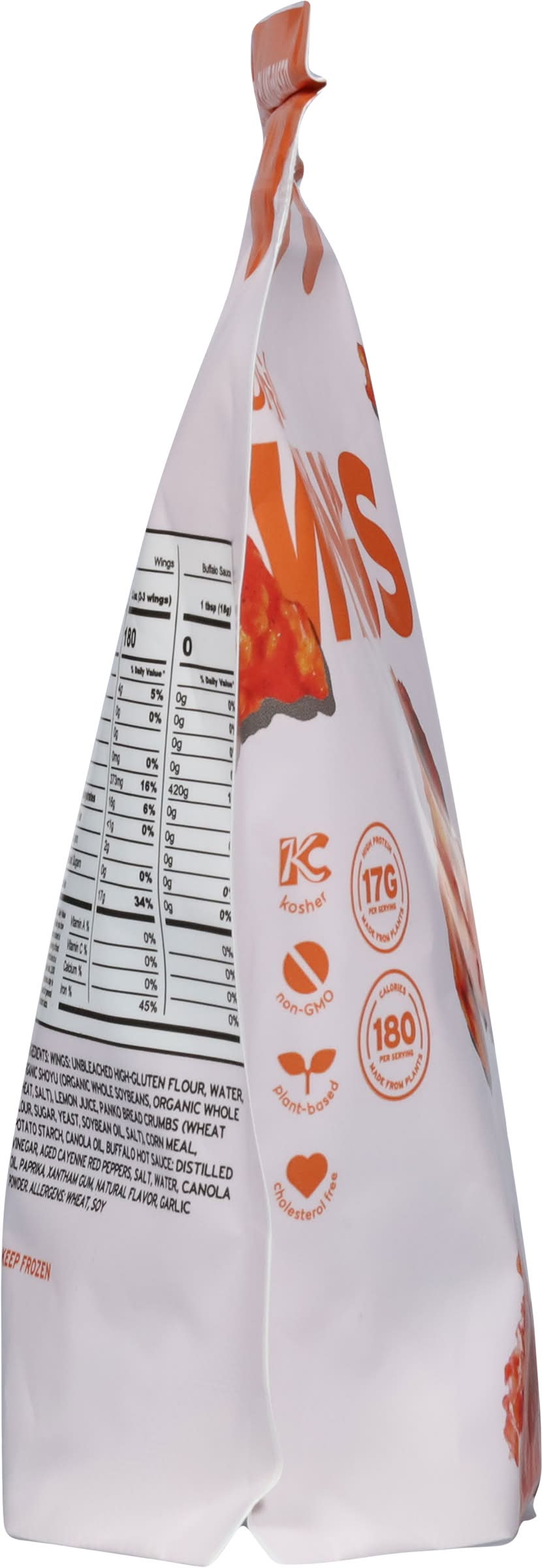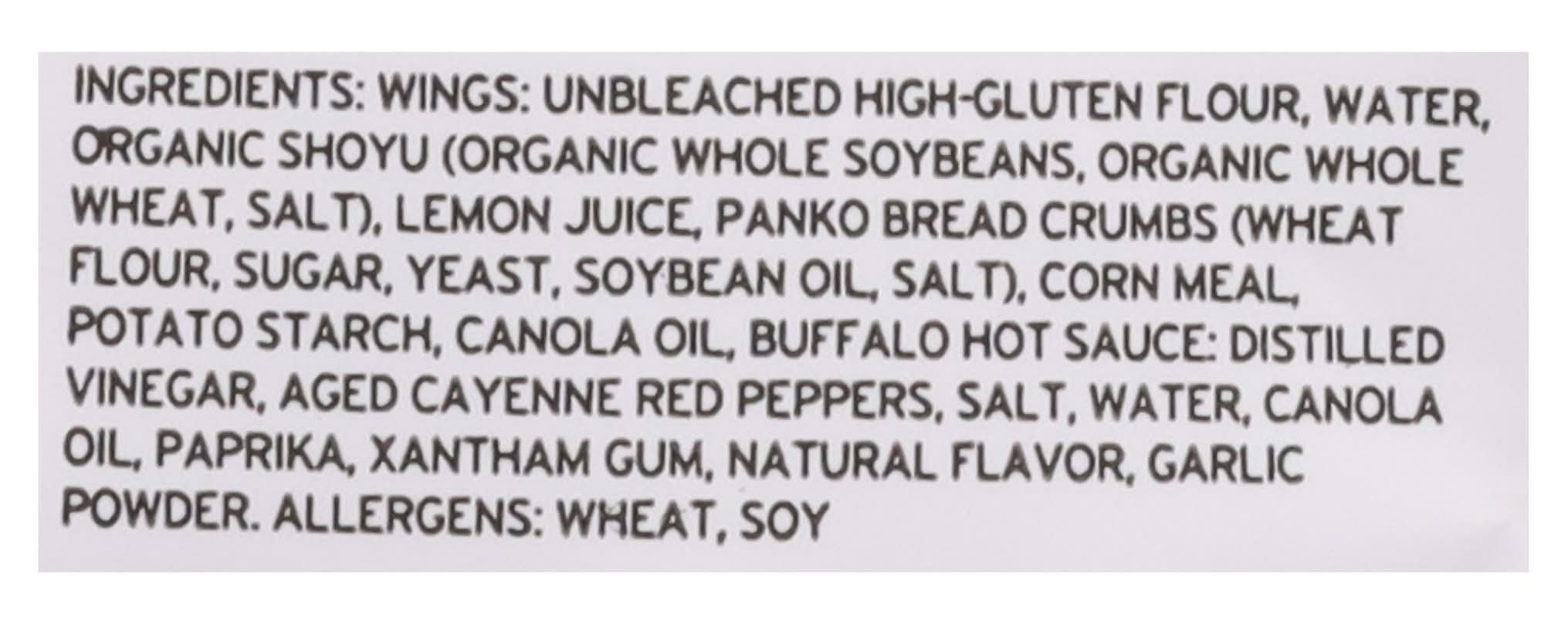 Ingredients: Wings: Unbleached High-Gluten Flour, Water, Organic Shoyu (Organic Whole Soybeans, Organic Whole Wheat, Salt), Lemon Juice, Panko Bread Crumbs (Wheat Flour, Sugar, Yeast, Soybean Oil, Salt), Corn Meal, Potato Starch, Canola Oil. Buffalo Hot Sauce : Distilled Vinegar, Aged Cayenne Red Peppers, Salt, Water, Canola Oil, Paprika, Xantham Gum, Natural Flavor, Garlic Powder. Contains: Wheat, Soybeans, Gluten, Corn