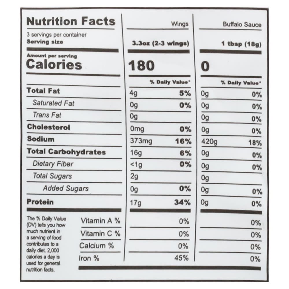 Directions for use: Cooking Instructions: Oven: 1. Preheat oven to 400 degrees F convection bake (or 425 degrees F regular bake). 2. Evenly place frozen Wings on baking sheet; set on center oven rack. 3. Bake 10 min, or until thoroughly heated and golden crisp, flipping halfway through. 4. While wings are cooking, place sauce packet in bowl of hot water to defrost. 5. Coat the wings with warm sauce or place in a bowl to dip; serve immediately and enjoy! Air Fry: 1. Cook wings from frozen at 400 degrees F for 6 minutes, flipping halfway through. 2. While wings are cooking, place sauce packet in bowl of hot water to defrost. 3. Coat the wings with warm sauce or place in a bowl to dip; serve immediately and enjoy! Keep frozen. Storage recommendation: Keep frozen.