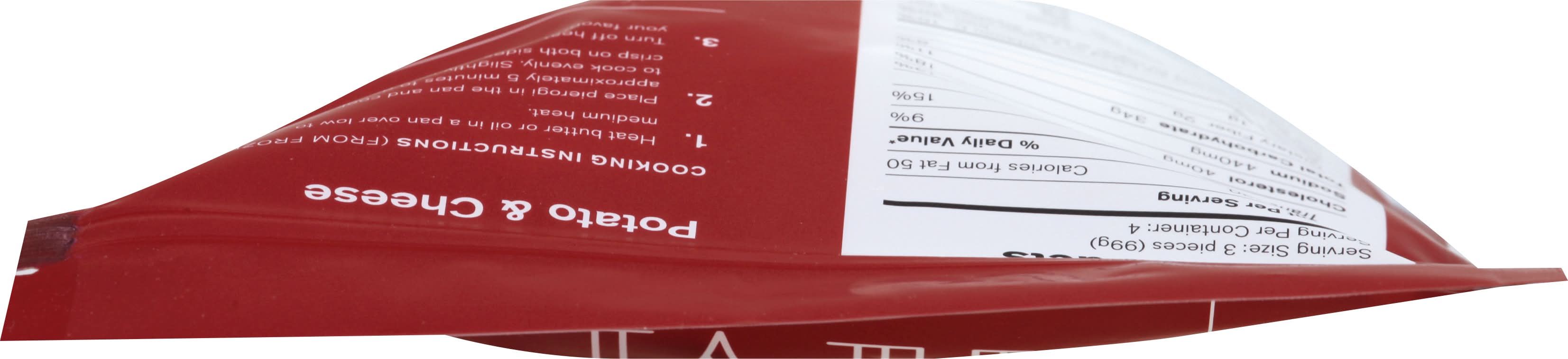 Ingredients: Potatoes, All Purpose Flour (Wheat Flour Malted Barley Flour Niacin Iron Thiamine Mononitrate Riboflavin), Farmers Cheese (Cultured Pasteurized Grade A Low Fat Milk), Water, Liquid Eggs, (Wholes Eggs Citric Acid 0.15% Water), Onion, Less than 2% of: Butter (Cream Natural Flavoring), Salt, Extra Virgin Olive Oil, Sugar, Black Pepper Contains: Wheat, Milk, Eggs, Soybeans, Peanuts, Tree Nuts