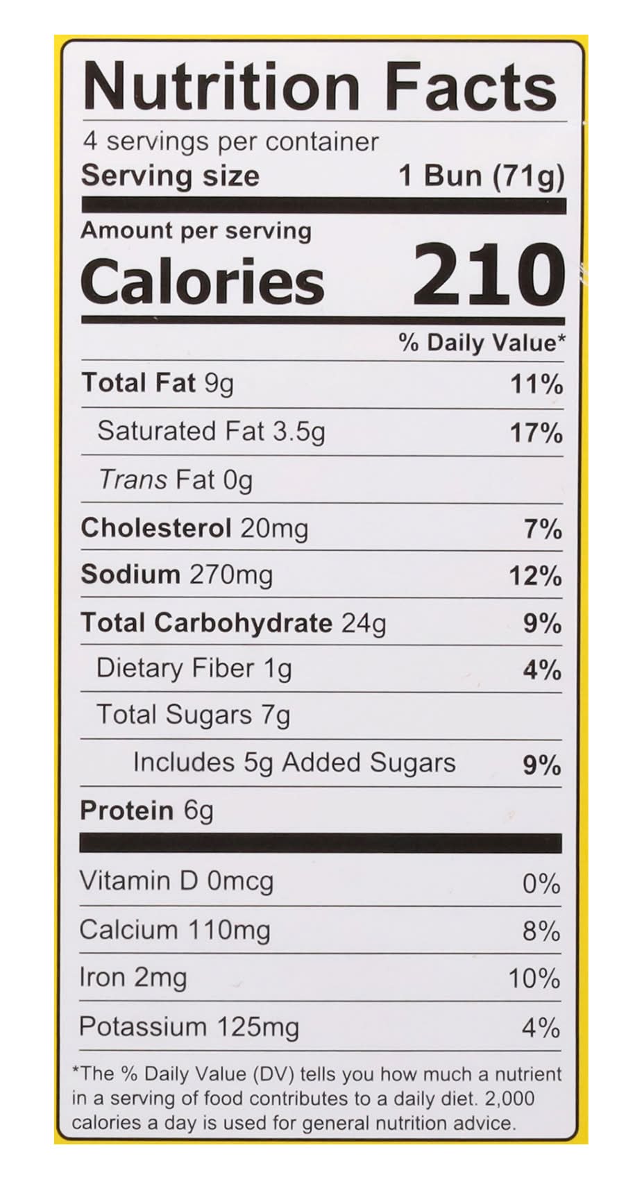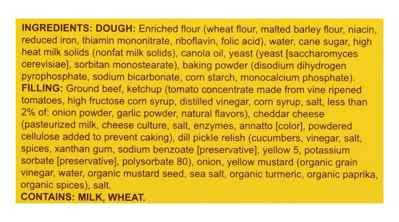 Ingredients: Dough: Enriched Flour (Wheat Flour, Malted Barley Flour, Niacin, Reduced Iron, Thiamin Mononitrate, Riboflavin, Folic Acid), Water, Cane Sugar, High Heat Milk Solids (Nonfat Milk Solids), Canola Oil, Yeast (Yeast [Saccharomyces Cerevisiae], Sorbitan Monostearate), Baking Powder (Disodium Dihydrogen Pyrophosphate, Sodium Bicarbonate, Corn Starch, Monocalcium Phosphate). Filling: Ground Beef, Ketchup (Tomato Concentrate Made from Vine Ripened Tomatoes, High Fructose Corn Syrup, Distilled Vinegar, Corn Syrup, Salt, Less than 2% of: Onion Powder, Garlic Powder, Natural Flavors), Cheddar Cheese (Pasteurized Milk, Cheese Culture, Salt, Enzymes, Annatto [Color], Powdered Cellulose Added to Prevent Caking), Dill Pickle Relish (Cucumbers, Vinegar, Salt, Spices, Xanthan Gum, Sodium Benzoate [Preservative], Yellow 5, Potassium Sorbate [Preservative], Polysorbate 80), Onion, Yellow Mustard (Organic Grain Vinegar, Water, Organic Mustard Seed, Sea Salt, Organic Turmeric, Organic Paprika, Organic Spices), Salt Contains: Milk, Wheat, Barley, Corn, Mustard