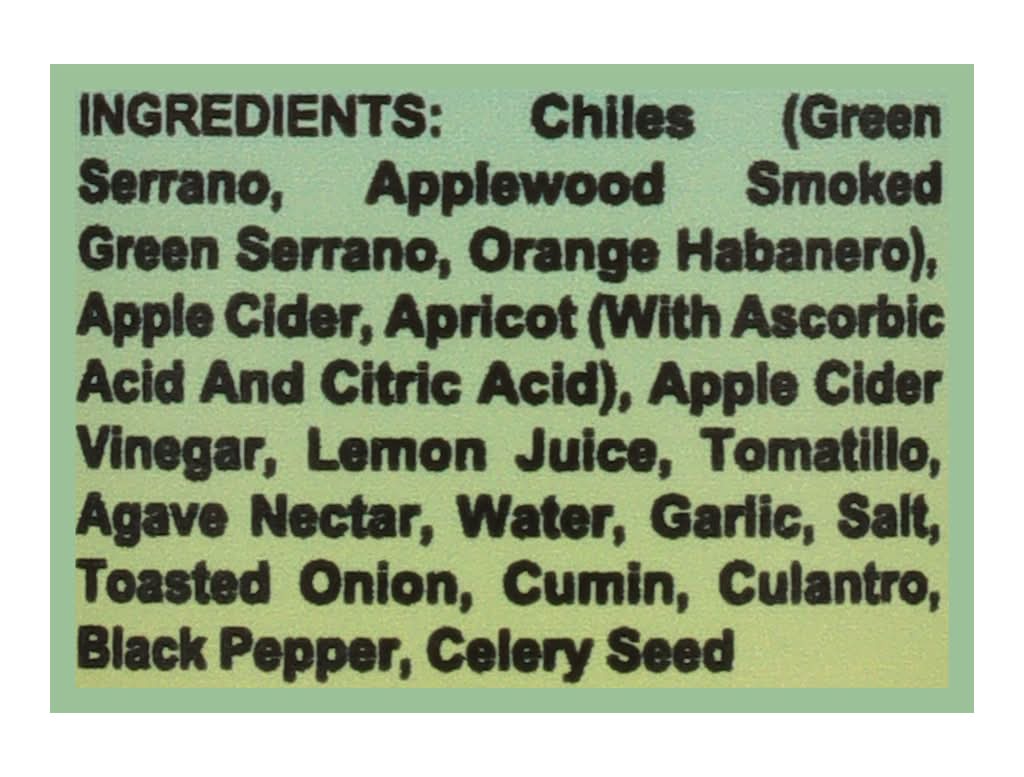Ingredients: Chiles (Green Serrano, Applewood Applewood Smoked Green Serrano, Orange Habanero), Apple Cider, Apricot (with Ascorbic Acid and Citric Acid), Apple Cider Vinegar, Lemon Juice, Tomatillo, Agave Nectar, Water, Garlic, Salt, Toasted Onion, Cumin, Culantro, Black Pepper, Celery Seed Contains: Celery