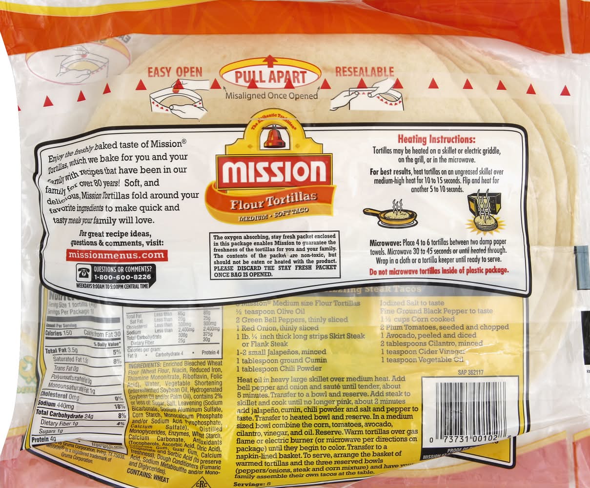 Heating instructions: tortillas may be heated on a skillet or electric griddle, on the grill, or in the microwave. for best results, heat tortillas on an ungreased skillet over medium-high heat for 10 to 15 seconds. flip and heat far another 5 to 10 seconds. microwave: place 4 to 6 tortillas between two damp paper towels. microwave 30 to 45 seconds or until heated through. wrap in a cloth or a tortilla keeper until ready to serve. do not microwave tortillas inside of plastic package. to preserve fresh-baked taste refrigerate after opening. the oxygen absorbing, stay fresh packet enclosed in this package enables mission to guarantee the freshness of the tortillas for you and your family. the contents of the packet are non-toxic, but should not be eaten or heated with the product. please discard the stay fresh packet once bag is opened.