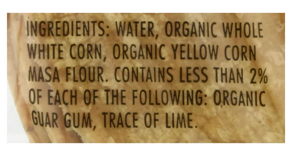 Ingredients: Water, Organic Whole White Corn, Organic Yellow Corn Masa Flour. Contains Less than 2% of Each of the Following: Organic Guar Gum, Trace of Lime