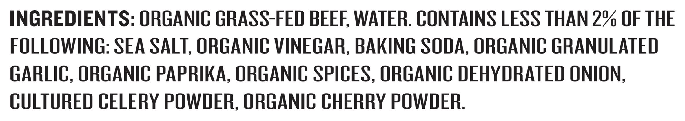 Ingredients: Organic Grass-Fed Beef (Beef Never Administered Antibiotics, Added Growth Hormones or Animal By-Products), Water, Contains Less than 2% of the Following: Sea Salt, Organic Spices, Organic Dehydrated Garlic, Organic Dehydrated Onion, Organic Paprika, Celery Powder Contains: Celery