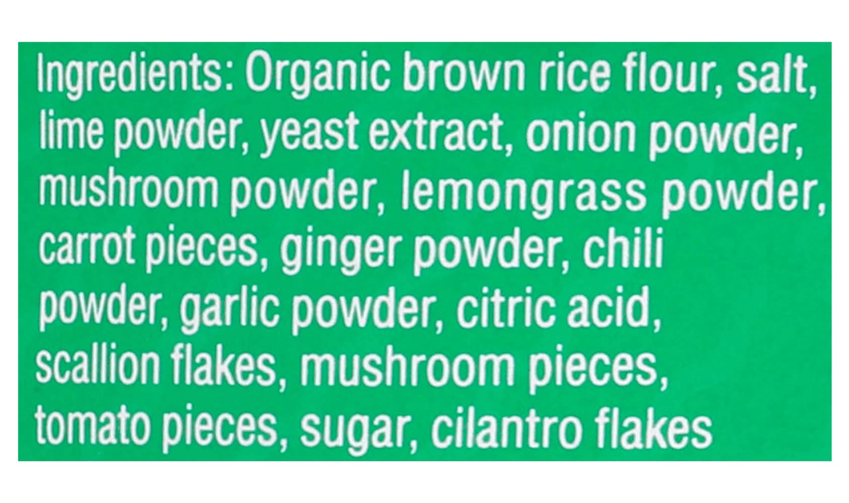 Ingredients: Organic Brown Rice Flour, Salt, Lime Powder, Yeast Extract, Onion Powder, Mushroom Powder, Lemongrass Powder, Carrot Pieces, Ginger Powder, Chili Powder, Garlic Powder, Citric Acid, Scallion Flakes, Mushroom Pieces, Tomato Pieces, Sugar, Cilantro Flakes