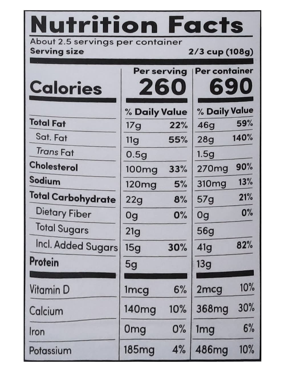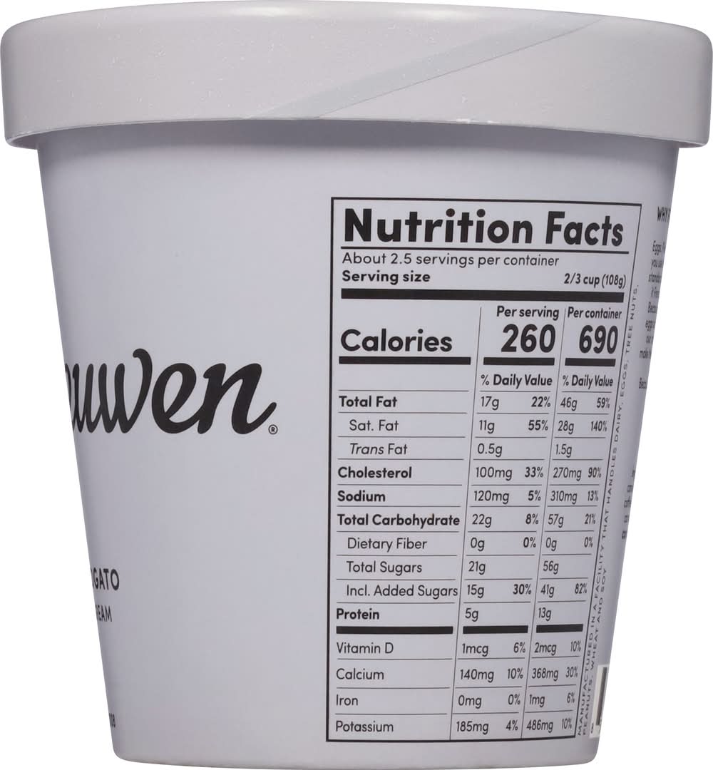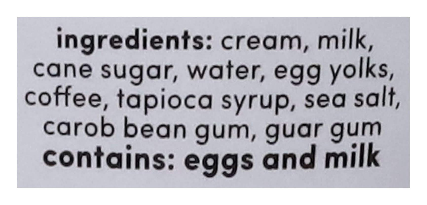Ingredients: Cream, Milk, Cane Sugar, Water, Egg Yolks, Coffee, Tapioca Syrup, Sea Salt, Carob Bean Gum, Guar Gum Contains: Eggs, Milk, Tree Nuts, Peanuts, Wheat, Soybeans
