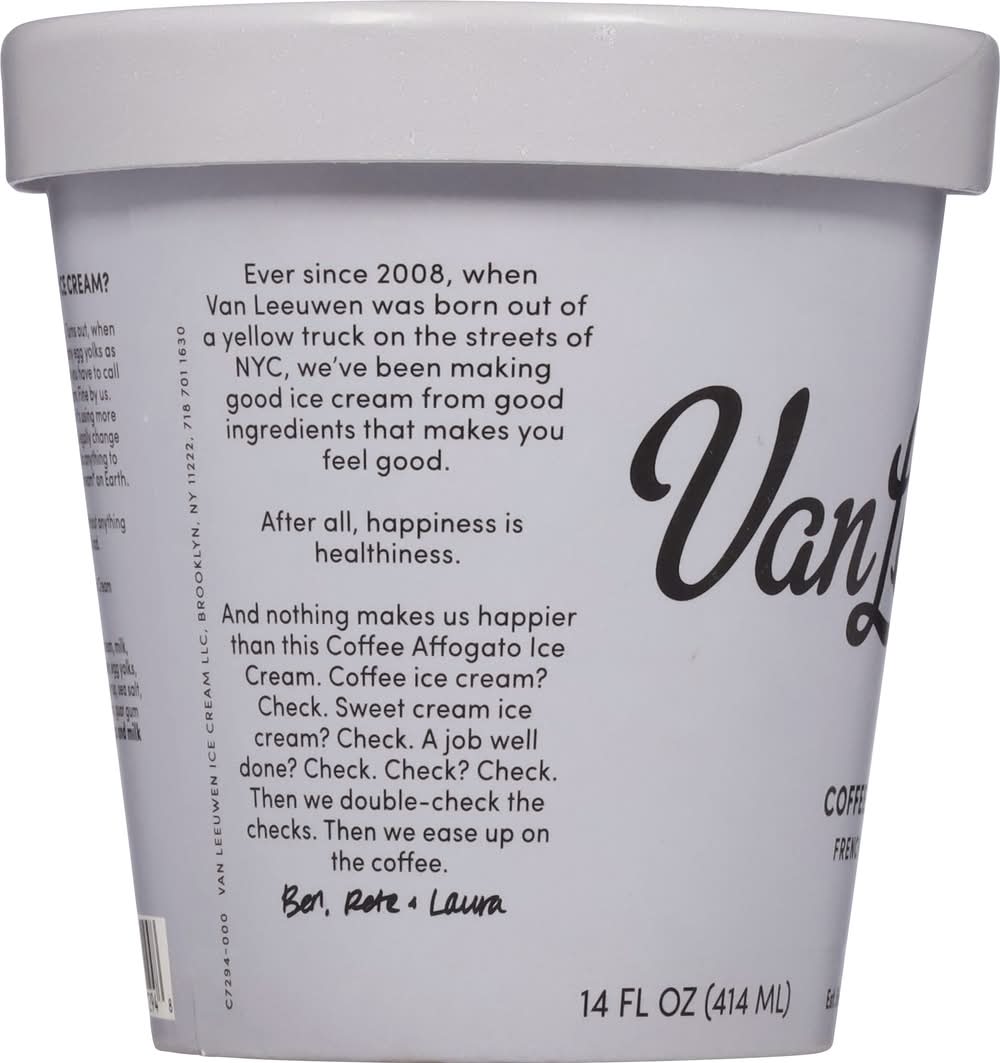A life without anything good is bad. Why french ice cream eggs. Plenty of 'em. Turns out, when you use twice as many egg yolks as standard ice cream you have to call it french ice cream. Fine by us. Because whether it's using more eggs or having to legally change our name, we'll do anything to make the best ice cream on earth. Because a life without anything good is bad. Ever since 2008, when van leeuwen was born out of a yellow truck on the streets of nyc, we've been making good ice cream from good ingredients that makes you feel good. After all, happiness is healthiness. And nothing makes us happier than this coffee affogato ice cream. Flavor: Coffee affogato