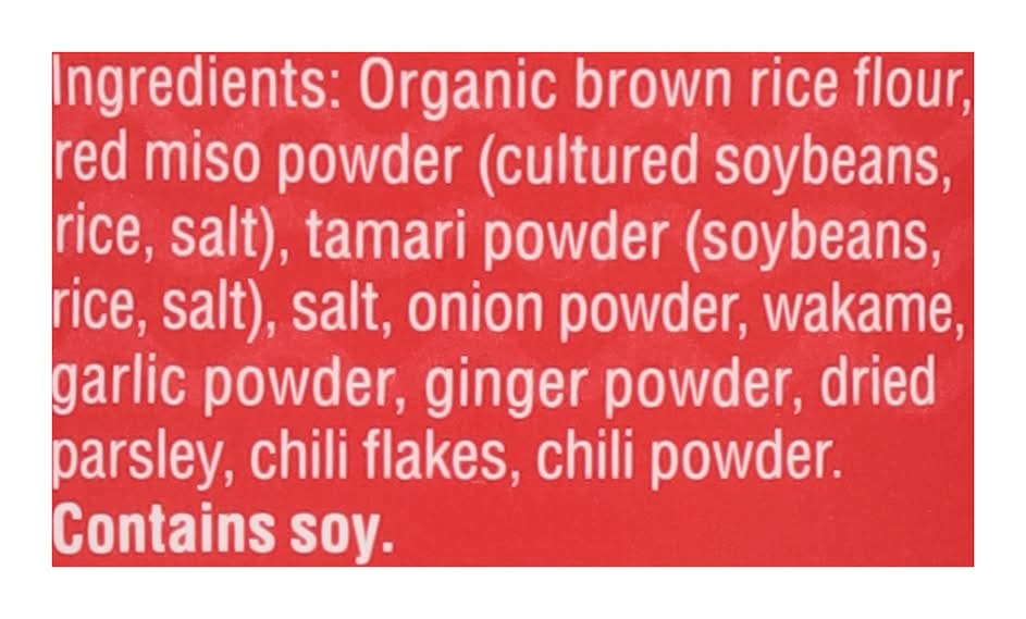 Ingredients: Organic Brown Rice Flour, Red Miso Powder (Cultured Soybeans, Rice, Salt), Tamari Powder (Soybeans, Rice, Salt), Salt, Onion Powder, Wakame, Garlic Powder, Ginger Powder, Dried Parsley, Chili Flakes, Chili Powder Contains: Soybeans