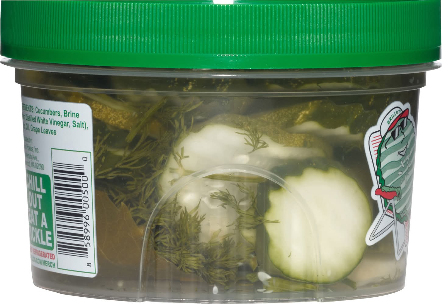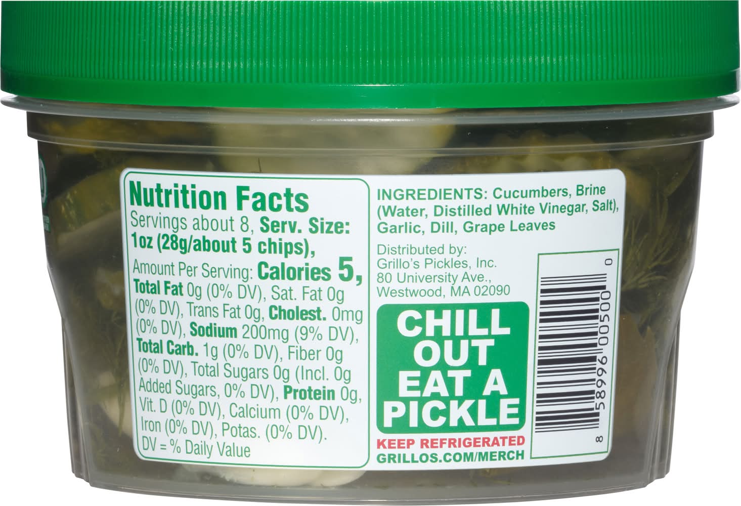 Ingredients: Cucumbers, Brine (Water, Distilled White Vinegar, Salt), Garlic, Dill, Grape Leaves