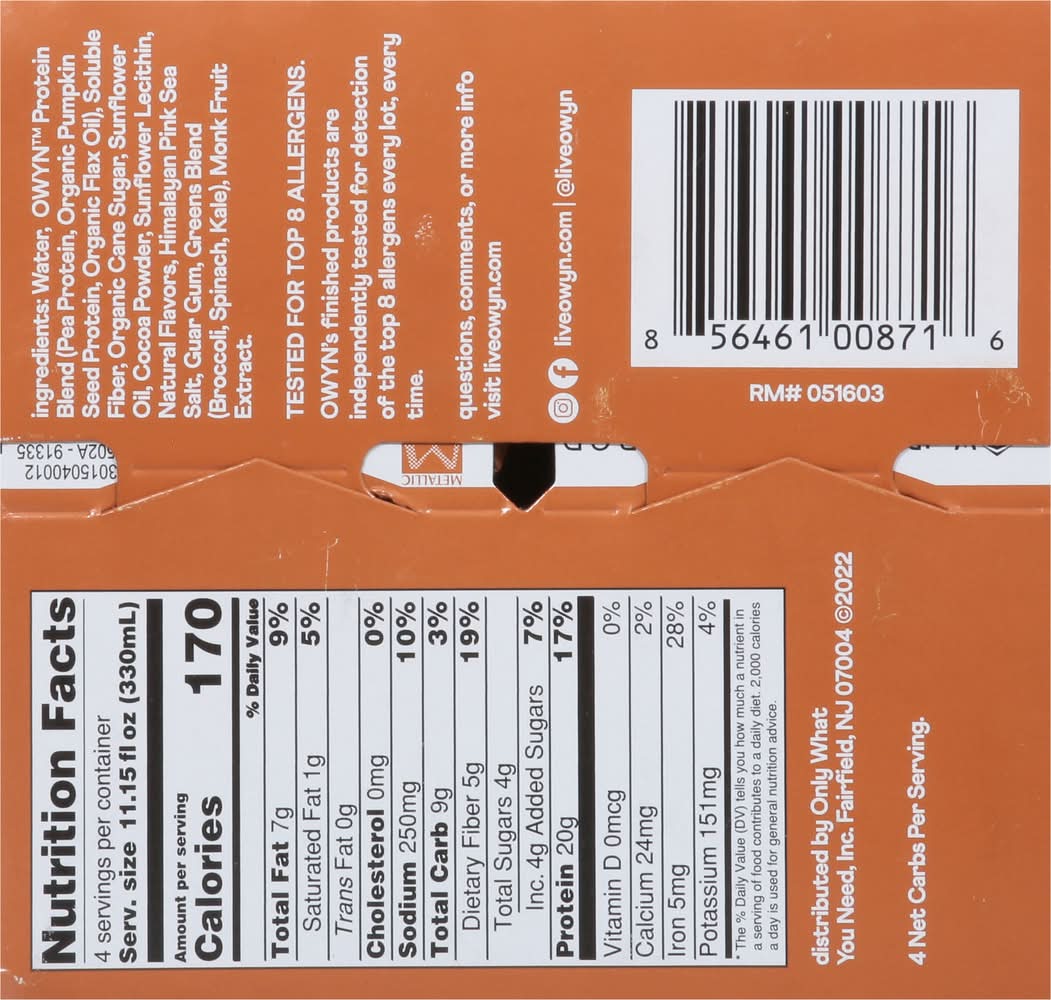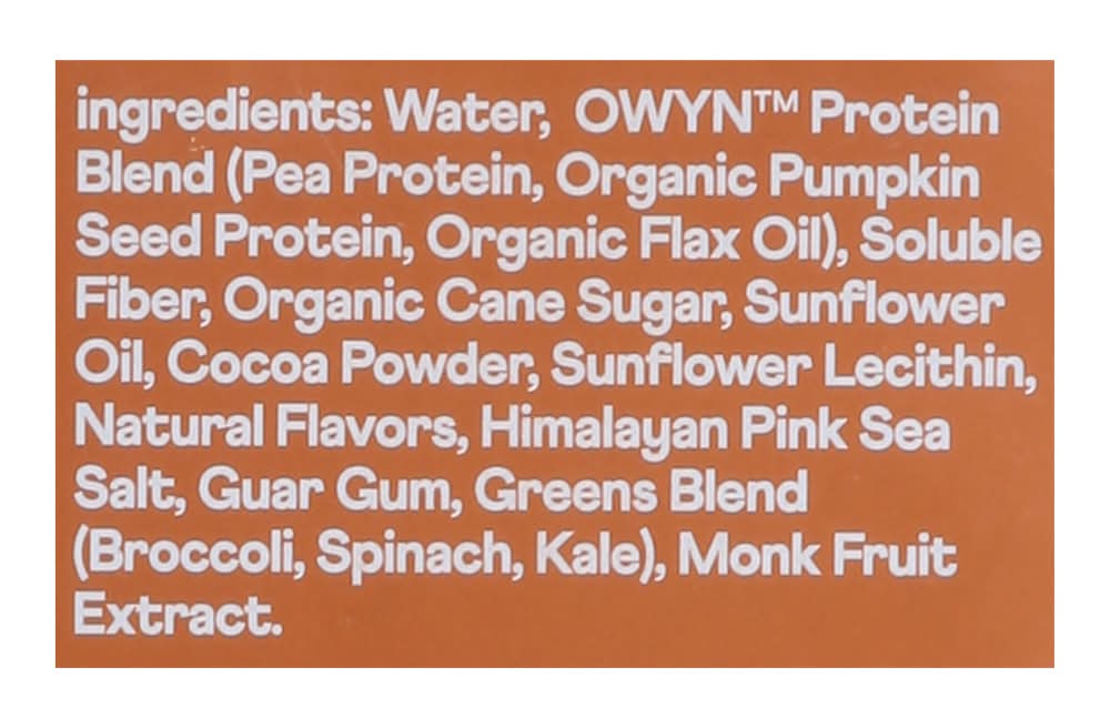 Ingredients: Owyn Protein Blend (Pea Protein, Organic Pumpkin Seed Protein, Organic Flax Oil), Soluble Fiber, Organic Cane Sugar, Sunflower Oil, Cocoa Powder, Sunflower Lecithin, Natural Flavors, Himalayan Pink Sea Salt, Guar Gum, Greens Blend (Broccoli, Spinach, Kale), Monk Fruit Extract