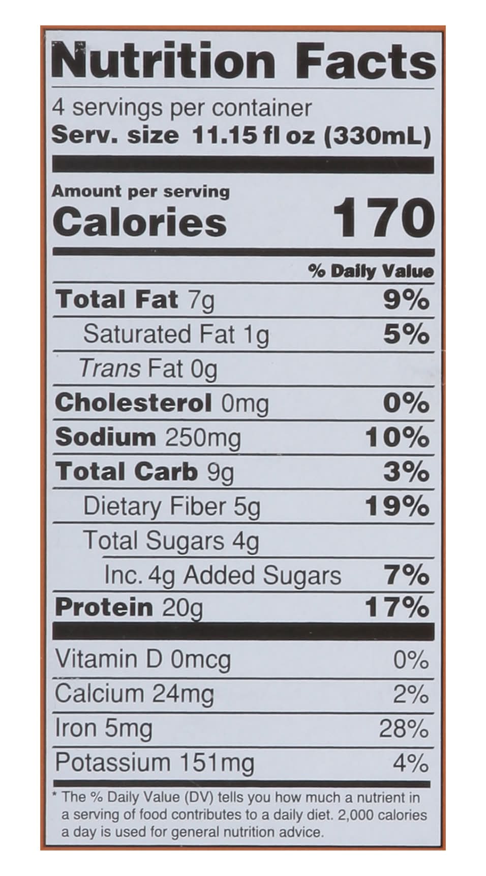 Free from the top 8 allergens. Friendly: No dairy, soy, peanut, tree nuts, wheat/gluten. Excellent source of fiber. Low sugar content. We milk plants, not cows. 100% plant-based. • Flavor: Dark chocolate • Pack size: 4