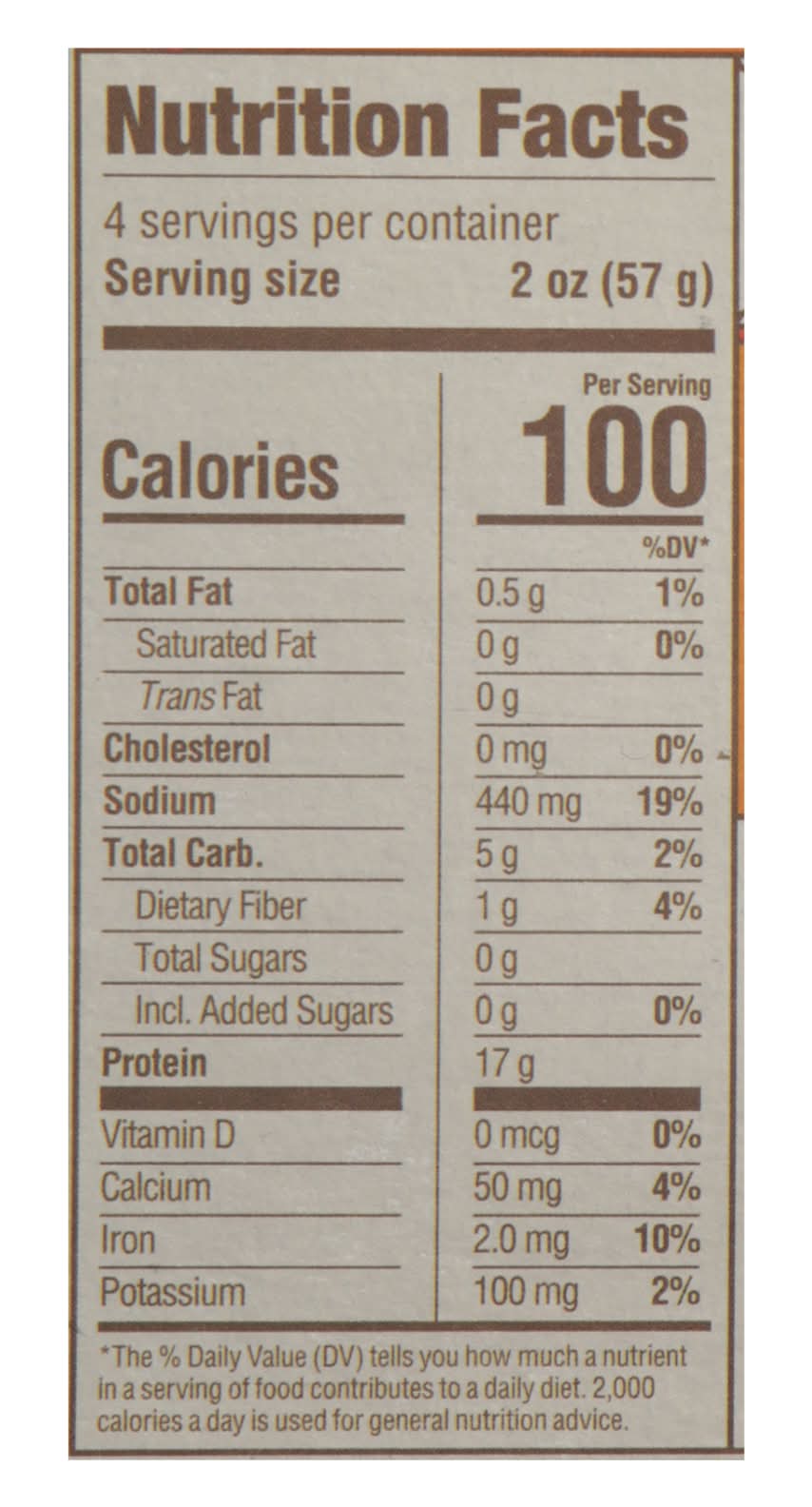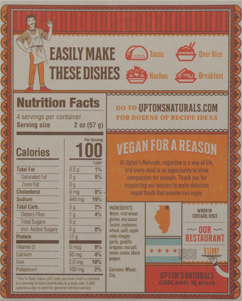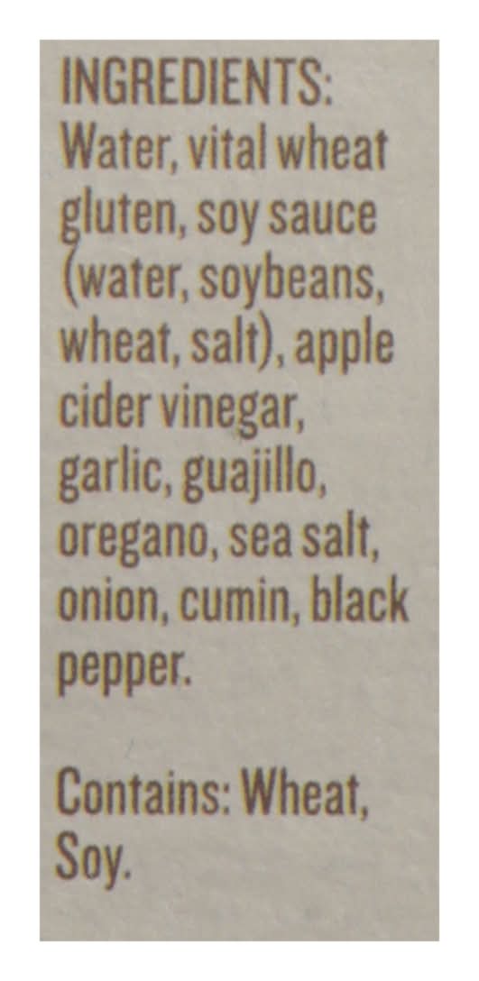 Ingredients: Water, Vital Wheat Gluten, Soy Sauce (Water, Soybeans, Wheat, Salt), Apple Cider Vinegar, Garlic, Guajillo, Oregano, Sea Salt, Onion, Cumin, Black Pepper Contains: Wheat, Soybeans, Gluten