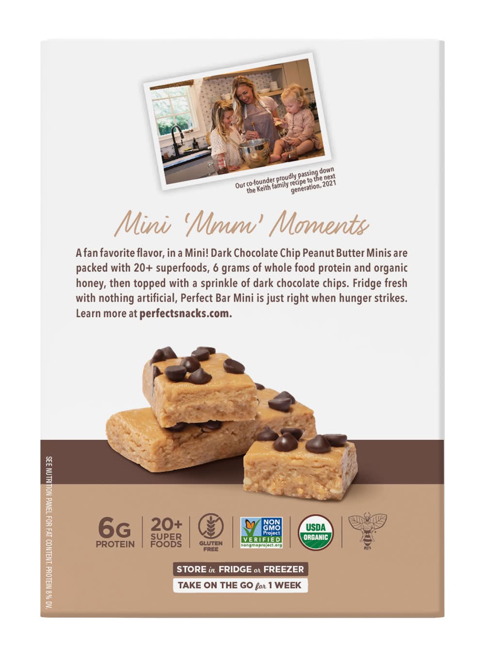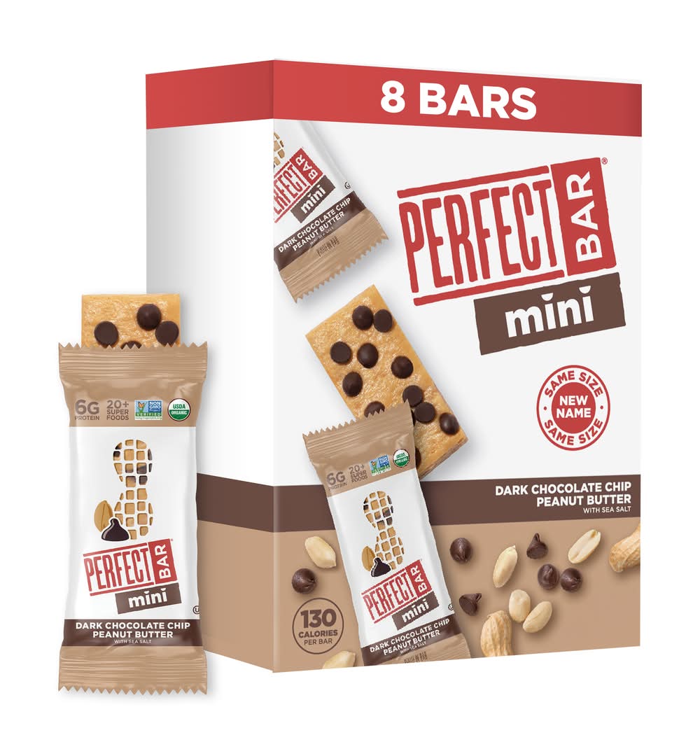 Dark chocolate chip peanut butter with sea salt. 130 calories per snack bar. 6 g protein. Protein 8% DV. USDA Organic. Certified Organic by QAI. Gluten free. See nutrition panel for fat content. Low Glycemic: Low Glycemic Index (GI) foods digest slowly to keep you fuller, longer. Non-GMO Project verified. nongmoproject.org. 20+ super foods. New name. Same size. Our co-founder proudly passing down the Keith family recipe to the next generation, 2021. Mini mmm Moments: A fan favorite flavor, in a Mini! Dark chocolate Chip Peanut Butter Minis are packed with 20+ superfoods, 6 grams of whole food protein and organic honey, then topped with a sprinkle of dark chocolate chips. Fridge fresh with nothing artificial, Perfect Bar Mini is just right when hunger strikes. perfectsnacks.com. Instagram. Facebook. Twitter. Learn more at perfectsnacks.com. FSC: Mix - Packaging from responsible sources. Flavor: Dark chocolate chip peanut butter