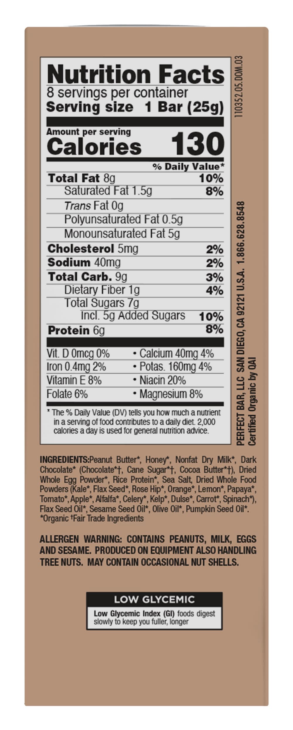 Ingredients: INGREDIENTS: Peanut Butter*, Honey*, Nonfat Dry Milk*, Dark Chocolate* (Chocolate*†, Cane Sugar*†, Cocoa Butter*†), Dried Whole Egg Powder*, Rice Protein*, Sea Salt, Dried Whole Food Powders (Kale*, Flax Seed*, Rose Hip*, Orange*, Lemon*, Papaya*, Tomato*, Apple*, Alfalfa*, Celery*, Kelp*, Dulse*, Carrot*, Spinach*), Flax Seed Oil*, Sesame Seed Oil*, Olive Oil*, Pumpkin Seed Oil*. *Organic †Fair Trade Ingredients Contains: Sesame